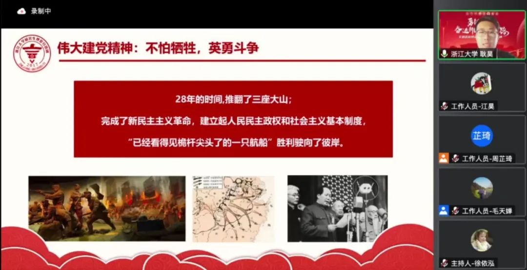 耿昊,来自浙江大学研究生理论宣讲团,他从建党精神里获取力量。他觉得,从百年党史中得到的精神力量,能够激励青年立足两个大局,促使中华民族伟大复兴的航船劈波斩浪前行。