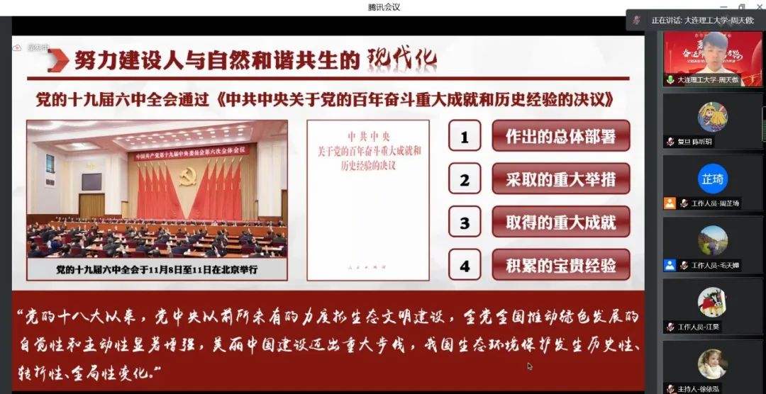 大连理工大学的周天傲,从生态文明建设这个角度着手,讲述了建设人类与自然和谐共生现代化的必要性。有五位讲师,分别从不一样的维度,阐明了国家发展大局针对青年一代的具体要求。