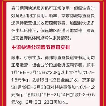 今年春节,快递服务整体持续得以保持运行,然而,的确是存在着时效延迟以及费用增加这样的情况。顺丰、京东、德邦、邮政是春节期间最为可靠的可供选择对象,而对于加盟制快递而言,则是需要预先去咨询当地网点。