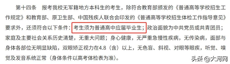 在2025年没军籍的地方本科生招生里,三所军医大学统一了说法,那就是口径。海军军医大学表明只招收普通高中应届毕业的学生,陆军军医大学提出考生得是普通高中应届毕业的学生,并且政治面貌是中共党员或者共青团员,空军军医大学也同样限定了是应届生身份。五所学校在2025年的招生政策方面维持了高度的一致。