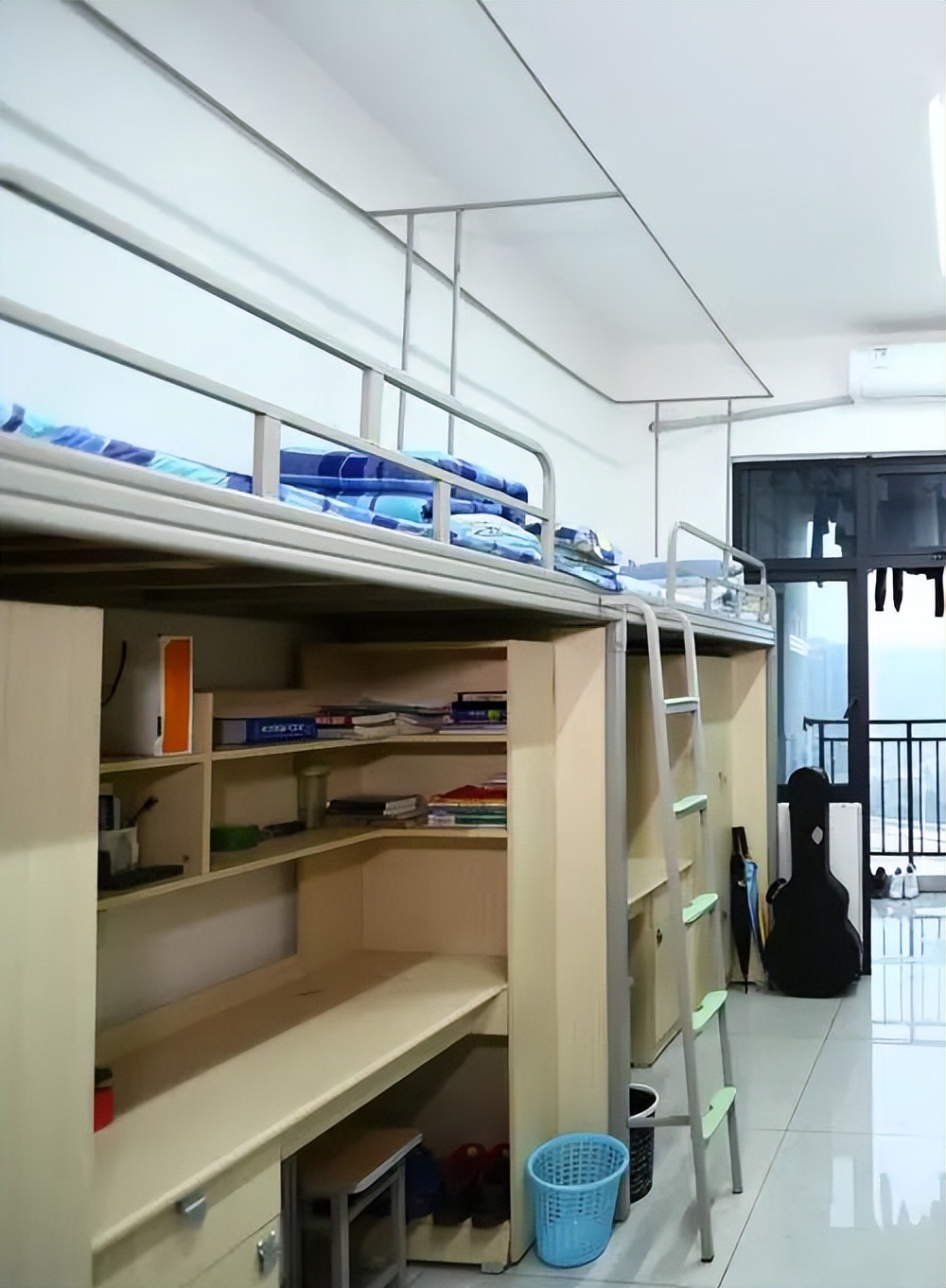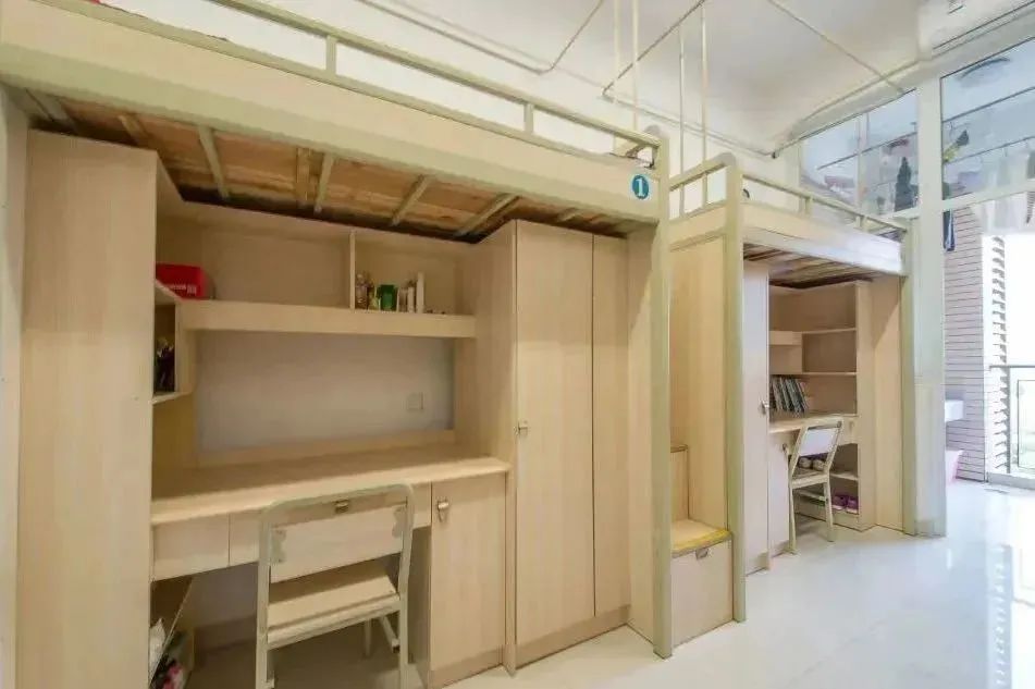 宿舍运用上床下桌的设计方式,设有独立的卫生间,还有阳台,配备了书架,以及衣柜。其布局非常合理,空间的利用率较高,个人物品具备放置的地方。