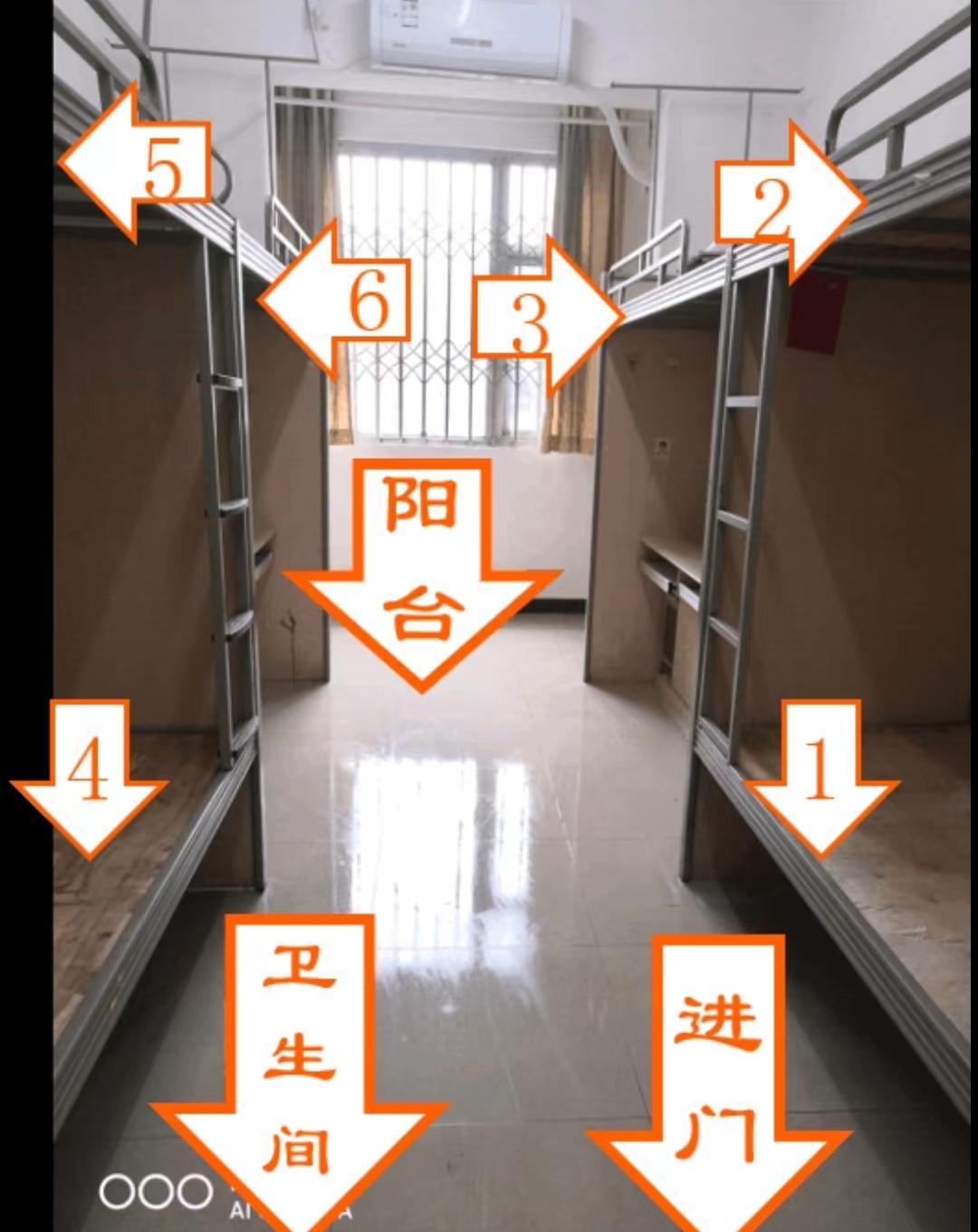 六人间宿舍是标准规格,卫生间独立,阳台也独立,空调配备,热水也配备。各自房间带有生活阳台,用于晾晒衣物,或者放置杂物。