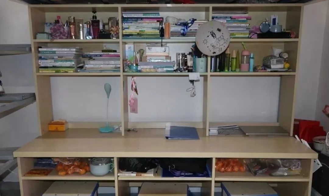 四人间宿舍,采用上床下桌这种样式设计,其中每个床位,各自带有五个书架,还有两层鞋柜,再有一个衣柜以及一个杂物柜,储物空间的设计极为细致,东西多的学生也有放置之处。