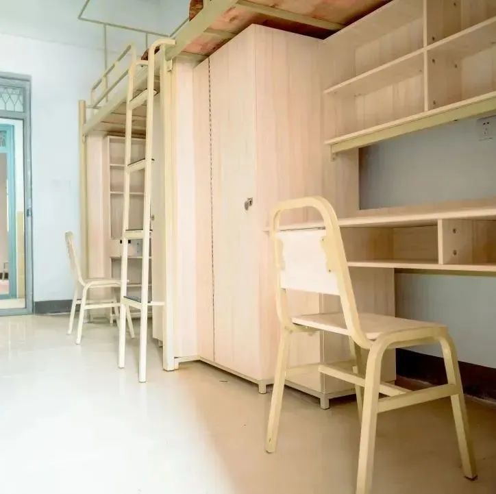 公寓针对学生实施公寓化管理举措,配备单人钢架床,还有衣柜,以及写字台,另外设有书架和椅子。家具虽说简单,然而该具备的全都具备了,其整体风格向着实用型偏向。