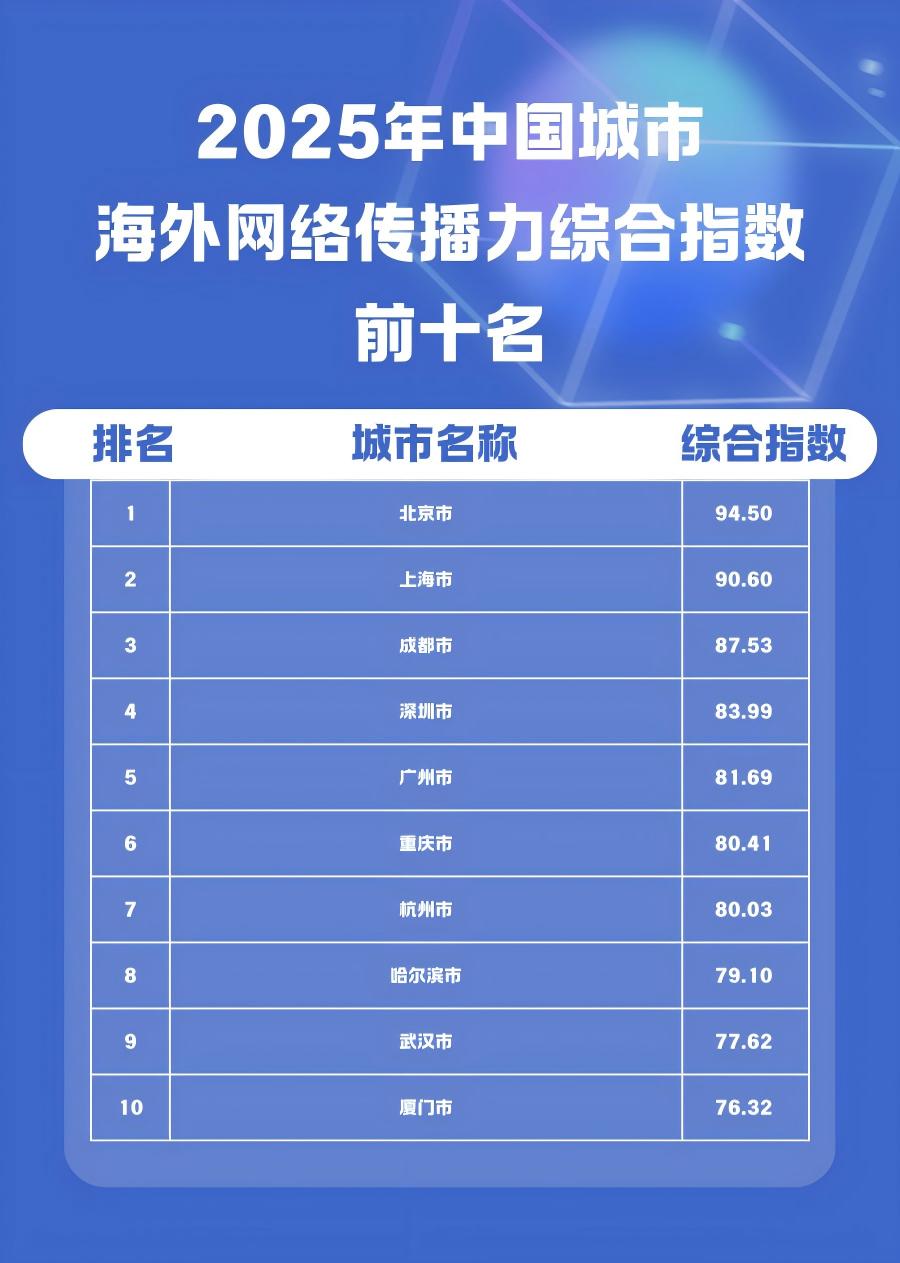 一份报告表明,北京、上海、成都在2025年海外传播力方面取得了前三名的成绩,而这样的结果并不是令人感到意外的。然而,真正具有趣味性的是增长最快的一系列城市名称,信阳市、乌兰察布市、益阳市等这些处于三四线层级的城市,冲到了较为靠前的位置,这充分说明海外传播已经不再只是沿海大城市所独有的一种特定活动。