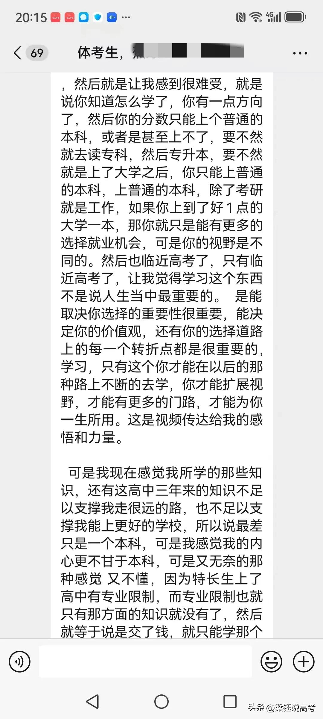 更加令他感到困惑的是,体育生所面临的专业限制致使他觉得自身身陷束缚之中。已然缴纳了费用便仅仅能够去学习与体育相关联的内容,这样的一种局限性使得他内心感到压抑以及难受。他在信息里再三提及,内心并不甘愿仅仅去上一所普通本科院校,然而却又充斥着满满的无力感。