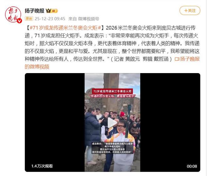 2025年12月22日,意大利庞贝古城遗址迎来一位特别的客人,在这座被火山灰掩埋将近两千年的古罗马城市当中,成龙身着白色火炬手服装,手里拿着奥运圣火,在一片残垣断壁之间穿梭行走,身后是维苏威火山,脚下是公元79年的街道,这种时空交错的景象,让现场围观的外国游客纷纷拿起手机拍照留念。