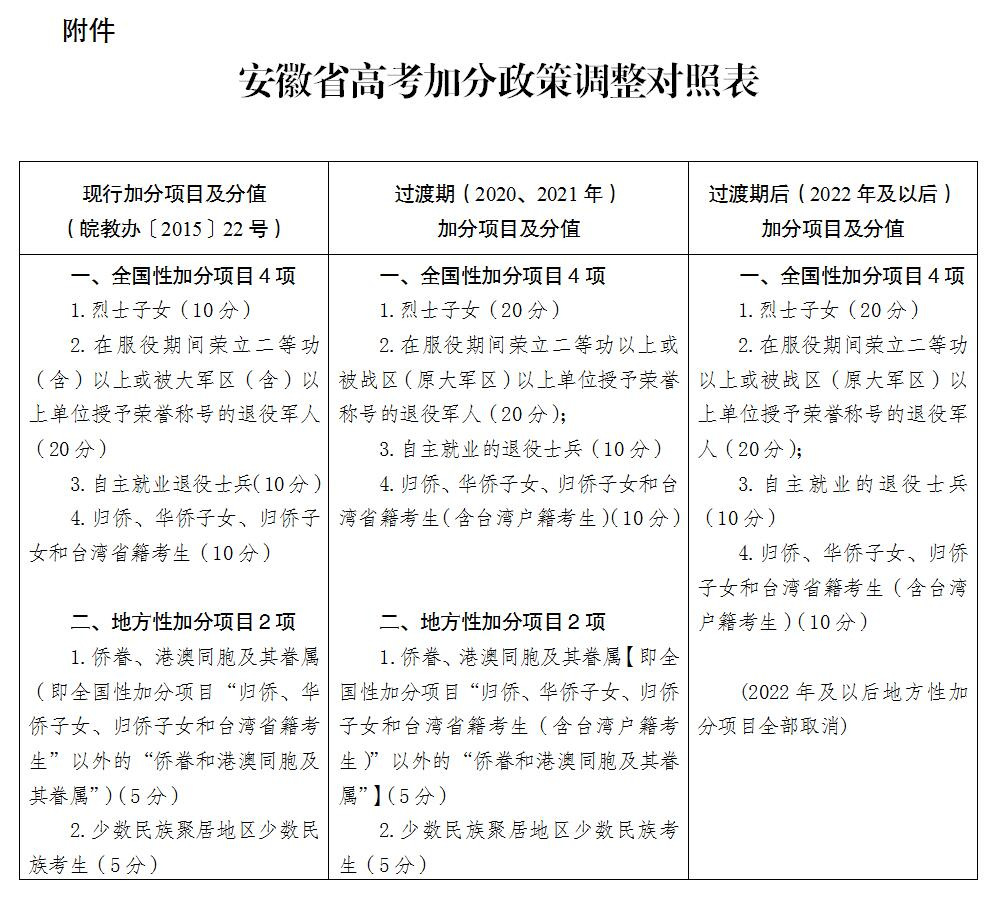2018年,安徽省所执行的全国性加分项目,总计有四项。对于烈士子女考生而言,其在高考总分上能够加10分。归侨、华侨子女以及归侨子女,还有台岛省籍考生,同样也是加10分。自主就业的退役士兵考生,可加10分。而那些在服役期间荣立二等功以上,或者被大军区以上单位授予荣誉称号的退役军人,是加20分。