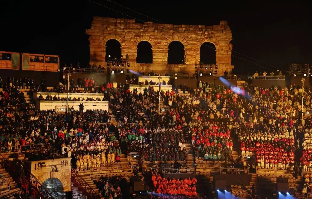 在公元一世纪便已存在的古迹维罗纳竞技场,于2月22日晚摇身一变成为冬奥会闭幕式的现场环境。奥运会历史上破天荒地将仪式安排在被列入世界文化遗产名录的历史古迹里进行举办,使得石头看台与现代灯光相互映照彼此生辉。现场有2万多名观众坐在往昔古人观看角斗的石阶之上,欣赏着以“行动之美”作为主题的表演内容。意大利歌剧选段在古老石墙之间来回飘荡回响;冬奥会主题从这一时刻正式开启向四年后的法国进行传递。
