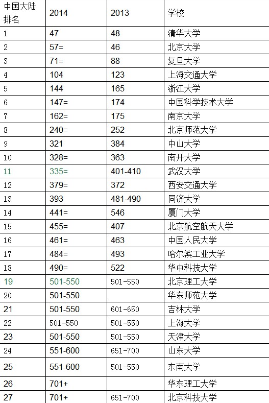 全球前800名中,中国大陆有27所大学入围,其中19所排名较去年有所提升。厦门大学提升最为显著,上升了105名 ,排至全球441名。山东大学、华中科技大学在学术声誉指标方面表现出色,分别上升了102位、101位。