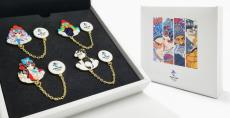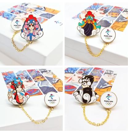 把京剧与冬奥会结合到一起的这套徽章,以简约动漫风格重新绘制京剧经典扮相,生旦净丑四个角色各有特点,生的英气,旦的华美,净的霸气和丑的诙谐,都浓缩于小小的徽章之中,每枚徽章由京剧人物和冬奥会徽章這两部分构成,中间由金色细链连接。