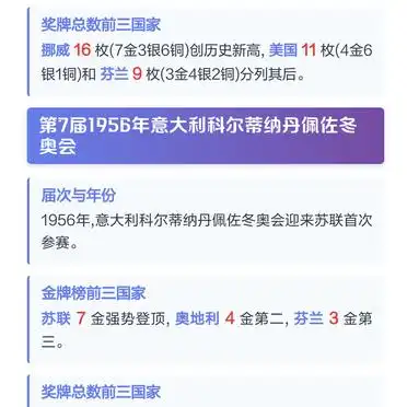 1956年,在意大利科尔蒂纳丹佩佐举办了冬奥会,这成为了冬奥会竞争格局的分水岭,首次参赛的苏联队展现出了极为惊人的统治力,凭借7枚金牌、16枚奖牌的战绩直接登上了奖牌榜首位,奥地利以4枚金牌位居第二,芬兰以3枚金牌排名第三,苏联的强势介入,打破了北欧国家长期以来垄断的局面。