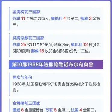 在1968年举办于法国格勒诺布尔的冬奥会上,挪威凭借6枚金牌的成绩再次回到榜首位置,并以5枚金牌的数量位居第二,东道主法国则凭借4枚金牌排名第三,此次赛事首次开展女子性别检测行为,推动了冬奥会公平竞赛机制朝着进一步完善的方向发展,挪威的回归表明传统冰雪强国并非走向衰落状态,而是与苏联达成了新的竞争平衡。