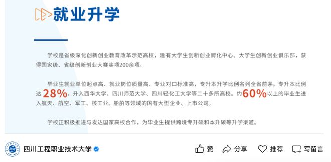 职业本科,在好多人脑海之中,依旧是“高职高专”那样的层次,家长通常不太乐意让自家孩子报考。然而,四川工程职业技术大学凭借就业相关数据,打破了这般偏见。该校毕业生,超过60%进入了航空领域、航天领域、军工领域、核工业领域、船舶领域的国有大型企业以及上市公司。