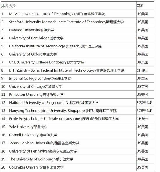连续第五年,麻省理工学院蝉联世界第一,斯坦福大学以及哈佛大学紧紧跟随在其后,分别排列为第二和第三位。自2004年起始至此,美国高校首次将全球前三名全部包揽,这彰显出美国高等教育具备的强大雄厚实力。