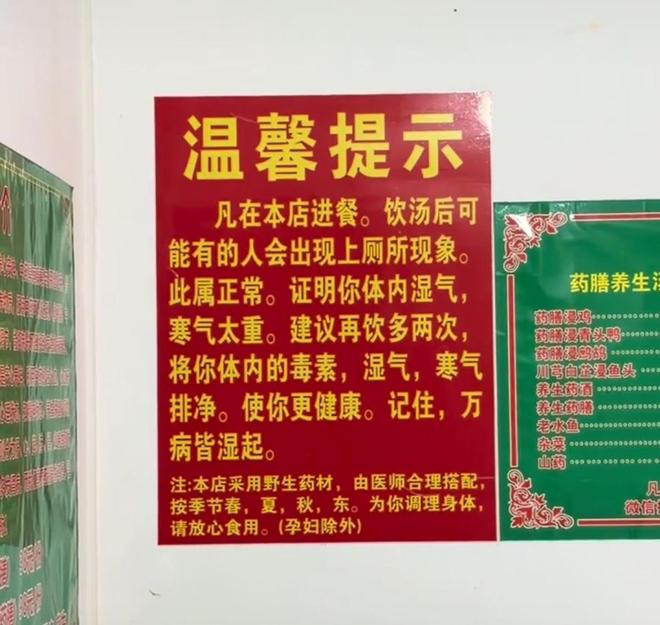 åºå å¼ è´´çä¸å¼ âæ¸©é¦¨æç¤ºâ乿äºç½å们çè®®çç¦ç¹ãä¸é¢åéï¼âå¡å¨æ¬åºè¿é¤ï¼é¥®æ±¤åå¯è½æç人ä¼åºç°ä¸åæç°è±¡ï¼æ¤å±æ£å¸¸âï¼å¹¶è¡¥å è§£ééï¼è¿æ¯å 为汤ä¸å å ¥éçè¯æï¼æå©äºæåºä½å 湿æ°ã坿°ï¼æ¯âæå£èä¸ºä½ è°ç身ä½âï¼è¿ç¹å«å¤æ³¨âåå¦é¤å¤âã