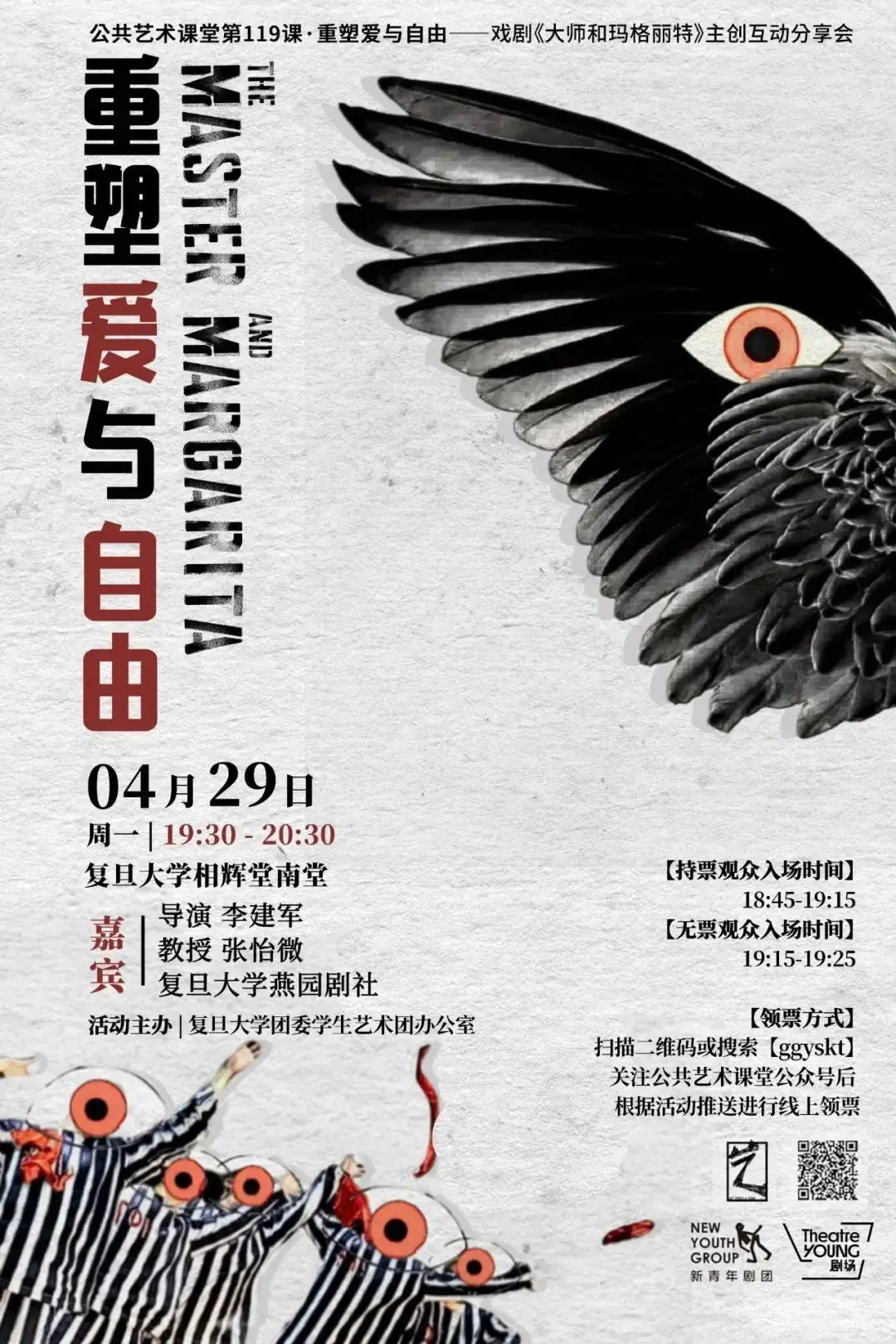 七点起,药学院王建新教授讲述药物递送系统演化历程,从轻如鸿毛讲到至关重要,契合对医药范畴感兴趣之学生。七点半,公共艺术课堂延请戏剧《大师和玛格丽特》导演李建军莅临复旦,而与中文系副教授张怡微、燕园剧社成员展开联动沟通交互切磋。文学、戏剧、药学、佛学,晚间时候的讲座差不多涵盖人文学科以及医学界各处门派。