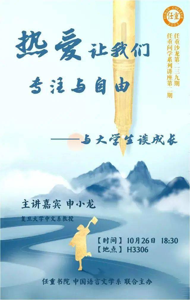 把时间确定为10月26日的晚上,任重沙龙的第239期,在申小龙教授的主持这个行为之下开始进行演讲,其主题是“热爱让我们专注和自由——与大学生谈成长”。申教授身为中国语言文学系的资深教师,结合自身求学的经历以及教学的经历,和同学们探讨了怎样在大学期间找到真实的兴趣点,并且把热爱转化为持续学习的动力。现场的互动氛围热烈,不少学生表示对于专业学习有了全新的认识。