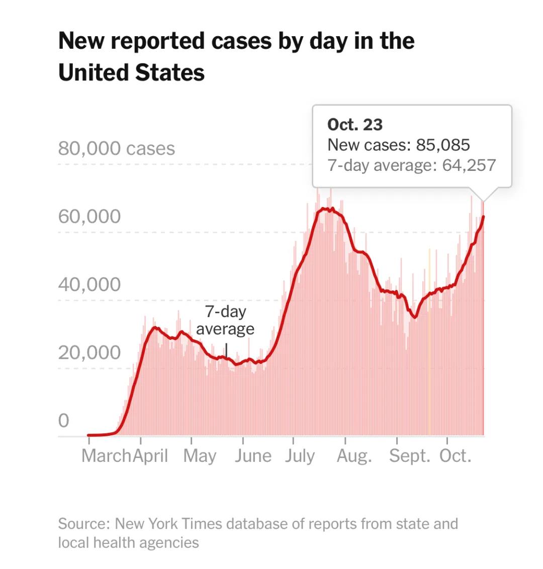 10月23日那天,美国单日新增的确诊病例数达到了85085例,所出现的这个数字超过了7月中旬所创下的75687例,进而成为疫情暴发以来的最高点。之前美国在春季时期的某个阶段和夏季阶段曾经经历了两波高峰时期,如今第三波高峰时期不仅到来得速度很快,而且其覆盖面也是更为宽广的。卫生官员使用“令人沮丧”这个词语去形容当前所呈现的状况,全美差不多75%的地区病例数都处于增长态势。这次高峰时期不像前两次集中在某一个特定区域,而是在全国范围之内“无差别暴发”,很多地方同时刷新了确诊纪录。