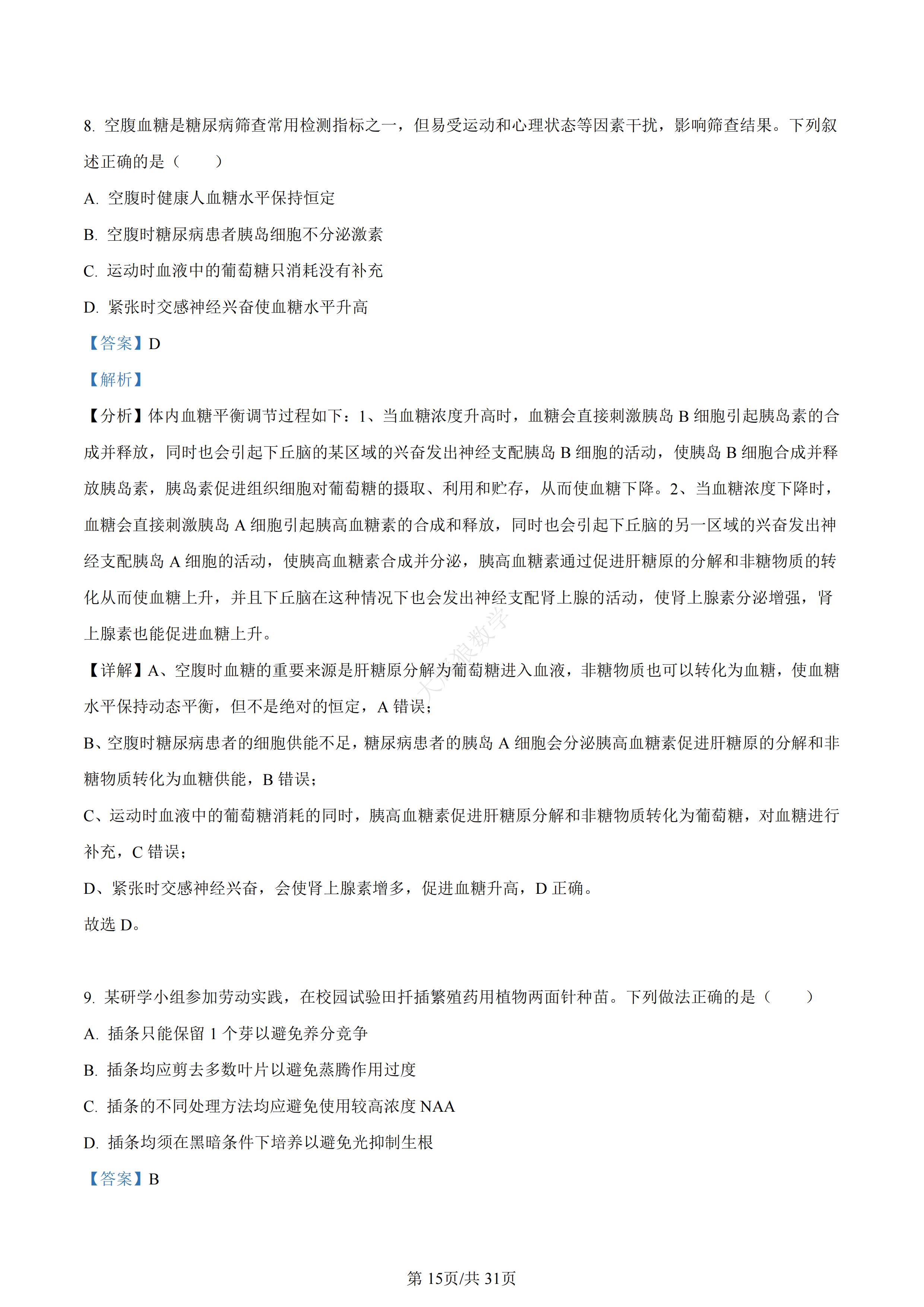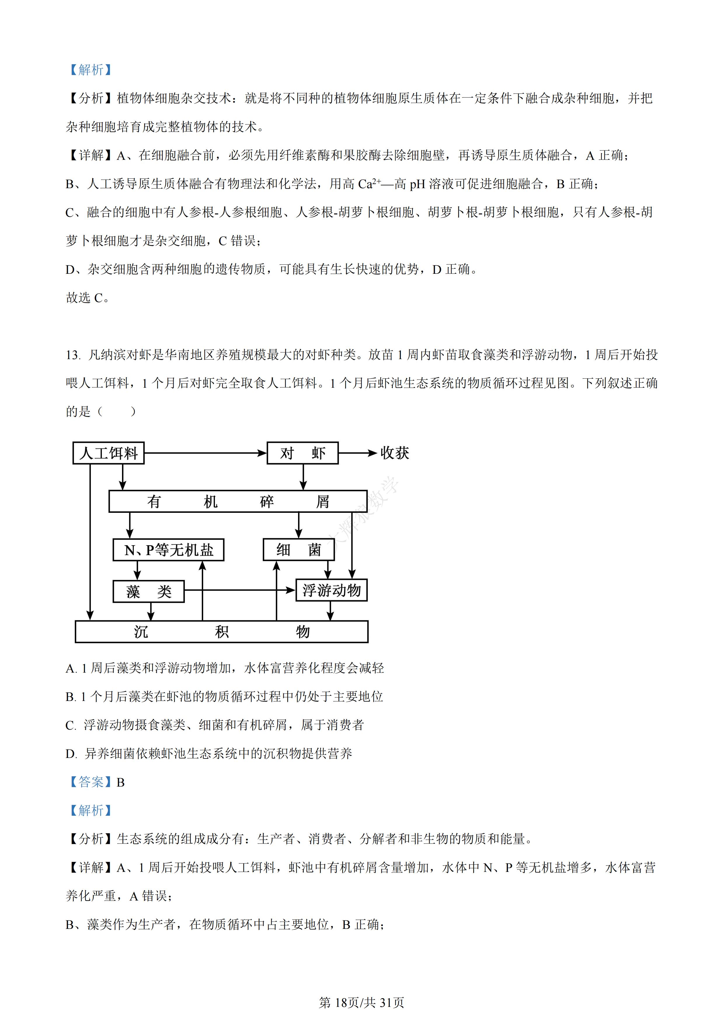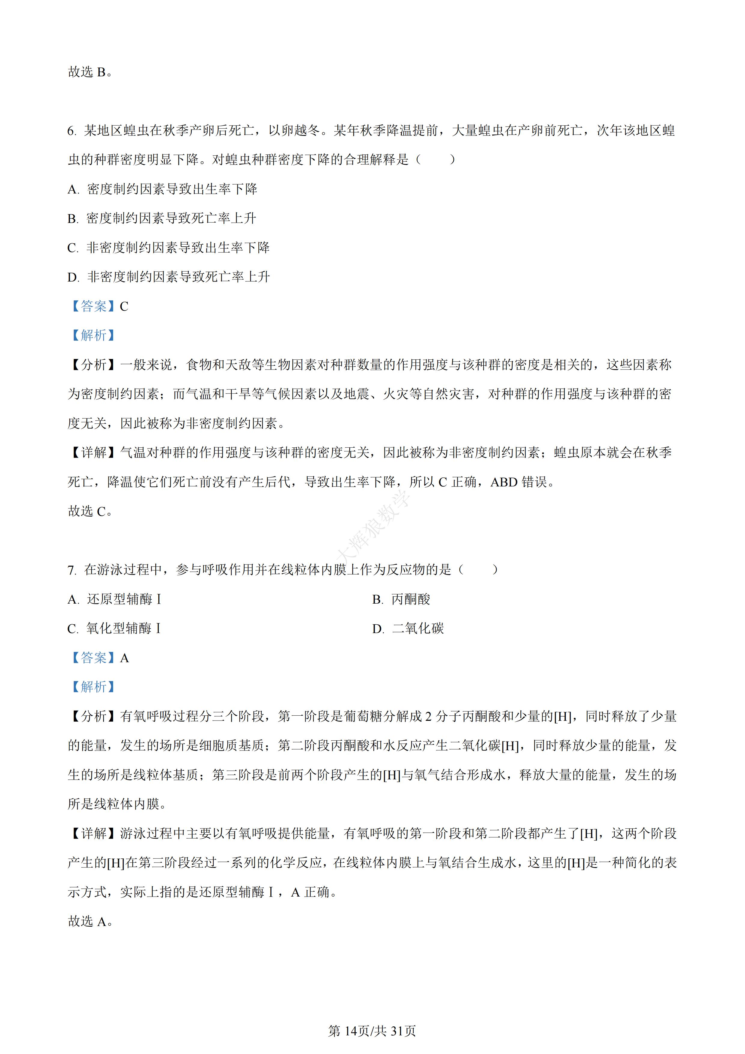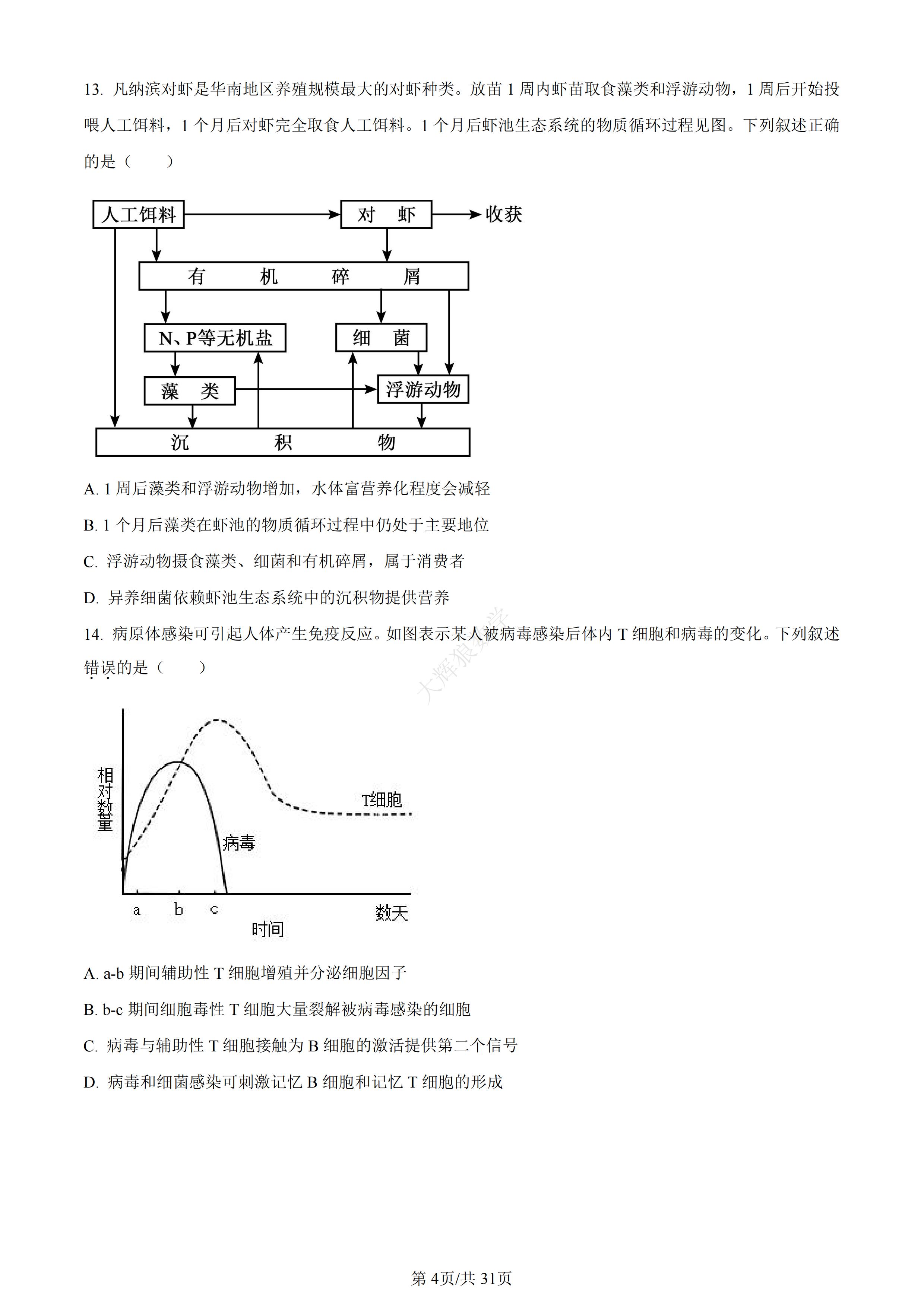 从第6题所涉及的蝗虫密度,到第8题的糖尿病筛查,之后是第13题的对虾养殖,生态保护与人类健康这两条主线极为清晰。第14题关于病毒感染,结合了当时处于后疫情时代的社会背景,考查免疫方面的知识。这对2024届考生起到提醒作用,一定要大量关注社会热点背后的生物学原理。