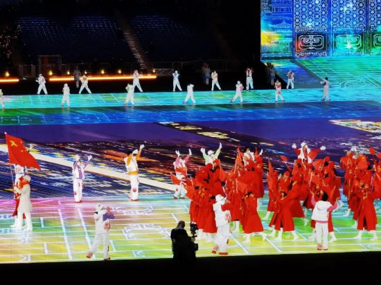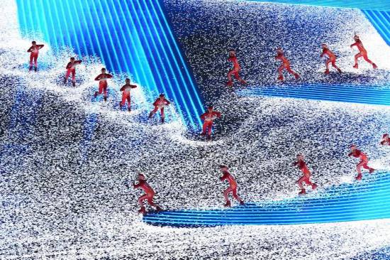 北京电影学院童雷教授带领的声音学院师生团队,与INTEL团队联合,完成了开幕式上最具梦幻感的视觉效果,在《Imagine》《漂亮的雪花》表演环节,演员脚下出现的“如影随形”浪漫效果,是借助实时捕捉和交互呈现技术达成的,近700名演员于超过一万平米的LED地屏上移动,动作毫无延迟,这在国际上也属首创的情况。