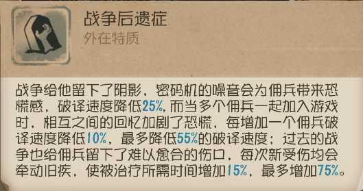 就算官方对战争后遗症做过调整,然而没带有治疗起到加速作用的、身为佣兵的角色还是极易被当作目标。一旦相关效果累积起来致使其倒地后,监管者将会转而追逐其他人员,如此一来密码机的进度便会被拖慢,进而使得整局的局面陷入被动状态之中。