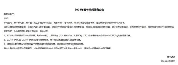 然而需要留意的是,尽管快递公司对外声称不会停运,可是具体落实到各个营业点或许会存在不一样的安排。德邦在今年喊出了“除夕能够发货,初一也会送货”的口号,顺丰则公布了详尽的资源调节费标准,从1月11日起至2月9日止,20公斤以上的陆运产品将会收取每公斤0.1到1.2元的费用。