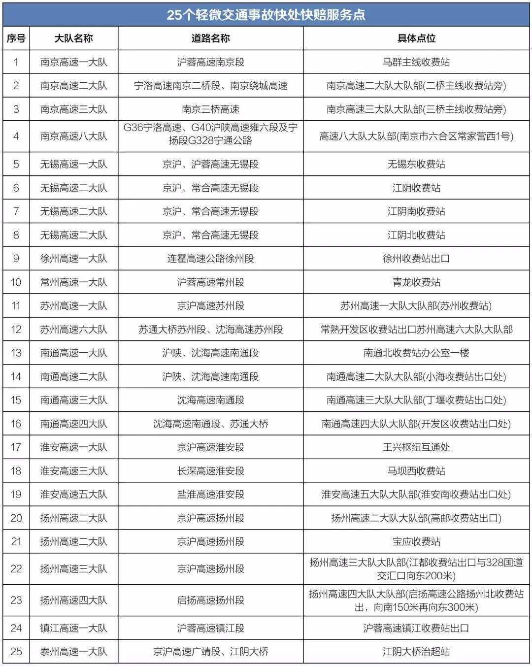 今年国庆长假时段内,为了给大家提供便利,全省高速沿线总共设置了25处事故快处快赔点,这些点位将主要的服务区与收费站出口基本涵盖在内,无论你在高速的哪一段路发生事故,均可在附近找到处理点。