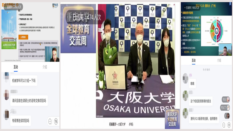 11月8日起至18日,重庆大学校园呈现出静悄悄的状态,然而线上却是热闹异常的景象。有来自10余个国家和地区的近40所国际知名大学,将宣讲会设置在了直播间。英国牛津大学、剑桥大学,美国加州大学伯克利分校,日本大阪大学,新加坡国立大学等名校的招生老师,依次进行展示,为重大学生带来了最直接的留学资讯。这不但属于信息的传递,更是一场跨越了时差和国界的学术对话。