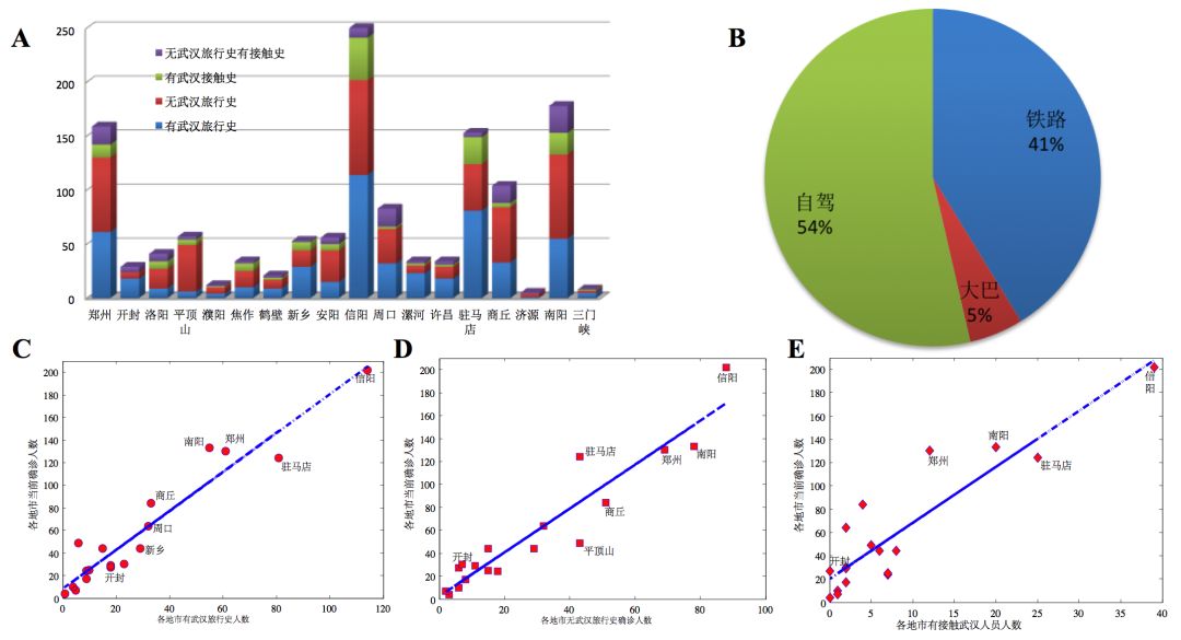 经分析表明,在各地市确诊病例里头,存在武汉旅行史的人数同当地总体确诊人数有着高度的关联性,此相关系数差不多接近于0.96。举例来说,像信阳、南阳、郑州等那些确诊病例数量较多的城市,其拥有武汉旅居史的患者数量明显也是更多的。