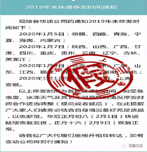 近几日,一张有着详细标注的“春节快递停运通知”的图片,在网络之上广泛热传。该图片呈现出,自12月25日起始,内蒙古、西藏、吉林等地区的快递便开始进入停运状态,直至2020年1月7日,在全国范围之内将会有27个省市出现停运情形。众多网友在看到之后,急忙下单进行囤货。