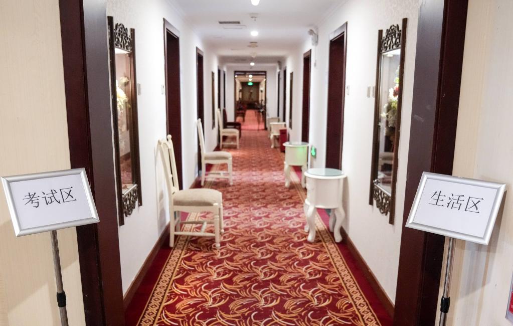 在首都北京朝阳区的一处酒店作为考点之地,那里走廊两侧的房间被划分成了生活区以及考试区,封控区的考生在此其中,生活区里住着考生,紧挨着考生所住之处与门而为对立面之处的对门当中,是被布置成为考场样子的房间,这样的一种设计使得考生一旦出门便马上进入考场,将与外部世界的接触以一种超大程度降低力度。从而实现了一人对一考场的情况。