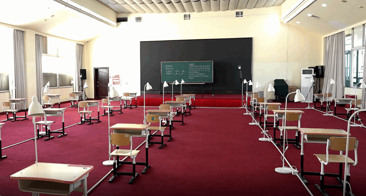 管控区考场的布置,同样是十分细致的,有一家酒店的会议室,被改造成了能够容纳30人的考场,其中的黑板以及课桌,都是来自学校的,考虑到酒店的灯光,有可能是不足的,因而工作人员为每一个考生,准备了落地台灯,以此来确保答题光线是充足的。