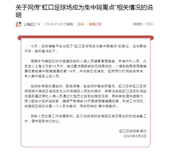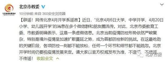 2020年3月,反复出现这样两条谣言,一条是北京4月6日大学开学,另一条是20日小学开学,并且上海虹口足球场变成隔离点,教委对此回应得很干脆直接,表示疫情严峻又复杂,开学时间得依据发展情况来确定,虹口更是觉得冤枉,其只是将体育场外场用作交接点,把入境人员从大巴转至街道的小车送回家,根本没有人住进去,而实际上政府要比老百姓更期望复工复学,真确定了日期肯定会召开正式发布会,不可能让朋友圈先知晓。