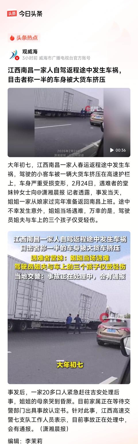 于2026年,逢到大年初七,在江西南昌的高速之上,有一辆出现被挤扁状况的小客车,在当下,全网都在等待着交警签发的一纸认定书呢。在视频可见,半边的车身紧紧贴着护栏之上,其车门也完全呈现了变形的模样,一家子人则驻足在路边,其中有人眼眶已然泛红。这样的一幕,刺痛了数量多少的返程之人的神经呀。