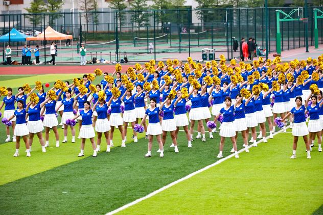 五彩旗帜被彩旗方队挥舞着,先是跑过,而后各二级学院的代表队开始入场。计算机系的同学们,高举着键盘造型的牌子,经济系的学生们,把股票K线图穿在了身上。最引人注目的是教职工代表队,平时站在讲台上的老师们,换上运动装,喊着“我运动我健康”的口号,赢得学生们最热烈的掌声和欢呼。