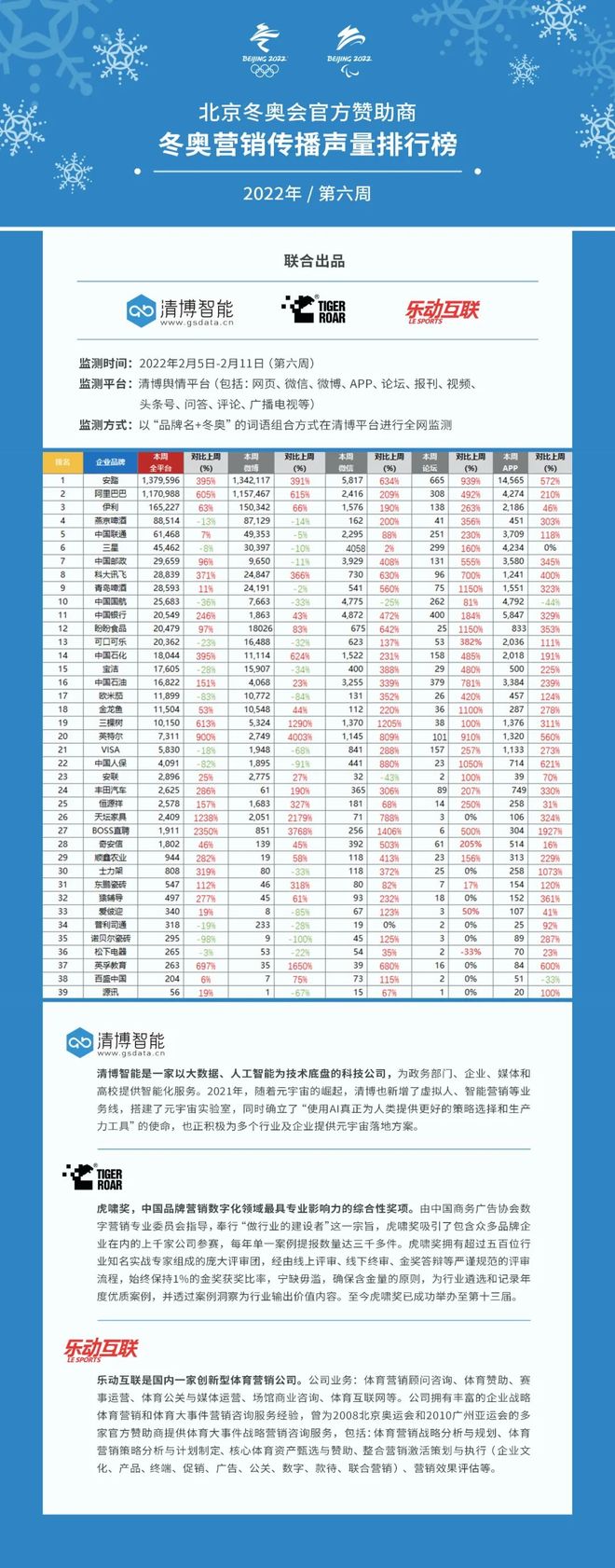 北京冬奥会首个比赛周方才完结,39家官方赞助商的营销战报便新鲜出炉,安踏稳稳当当占据头筹,阿里巴巴紧紧跟随不愿落后,伊利悄无声息地跻身前三。这份声量榜单的背后,呈现的是企业实实在在真金白银的投入以及智谋方面的较量。