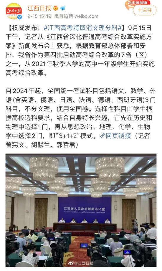 今年 9 月,黑龙江发布新高考方案,明确从 2021 年秋季入学的高一新生起取消传统文理分科,其方案显示学生要在物理和历史里首选 1 门,再从化学、生物、政治、地理中选 2 门,共组成 12 种组合。今年 9 月,甘肃也发布新高考方案,同样采取“3+1+2”模式且明确从 2021 年秋季入学的高一新生开始取消传统文理分科,2024 年起将实行统一高考与学业水平考试相结合的录取方式。今年 9 月,江西发布新高考方案,明确从 2021 年秋季入学的高一新生开始取消传统文理分科。
