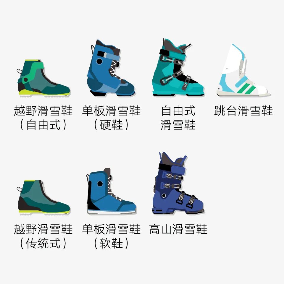 跳台滑雪所使用的雪板乃是所有双板之中长度最长、宽度最宽的,运动员腾空之后宛如长有羽翼,凭借板面条接住空气进而飛越至更远之处。自由式滑雪空中技巧的板子则短了许多,如此在空中做出翻跟头、拧转动作时才不至于相互碰撞。