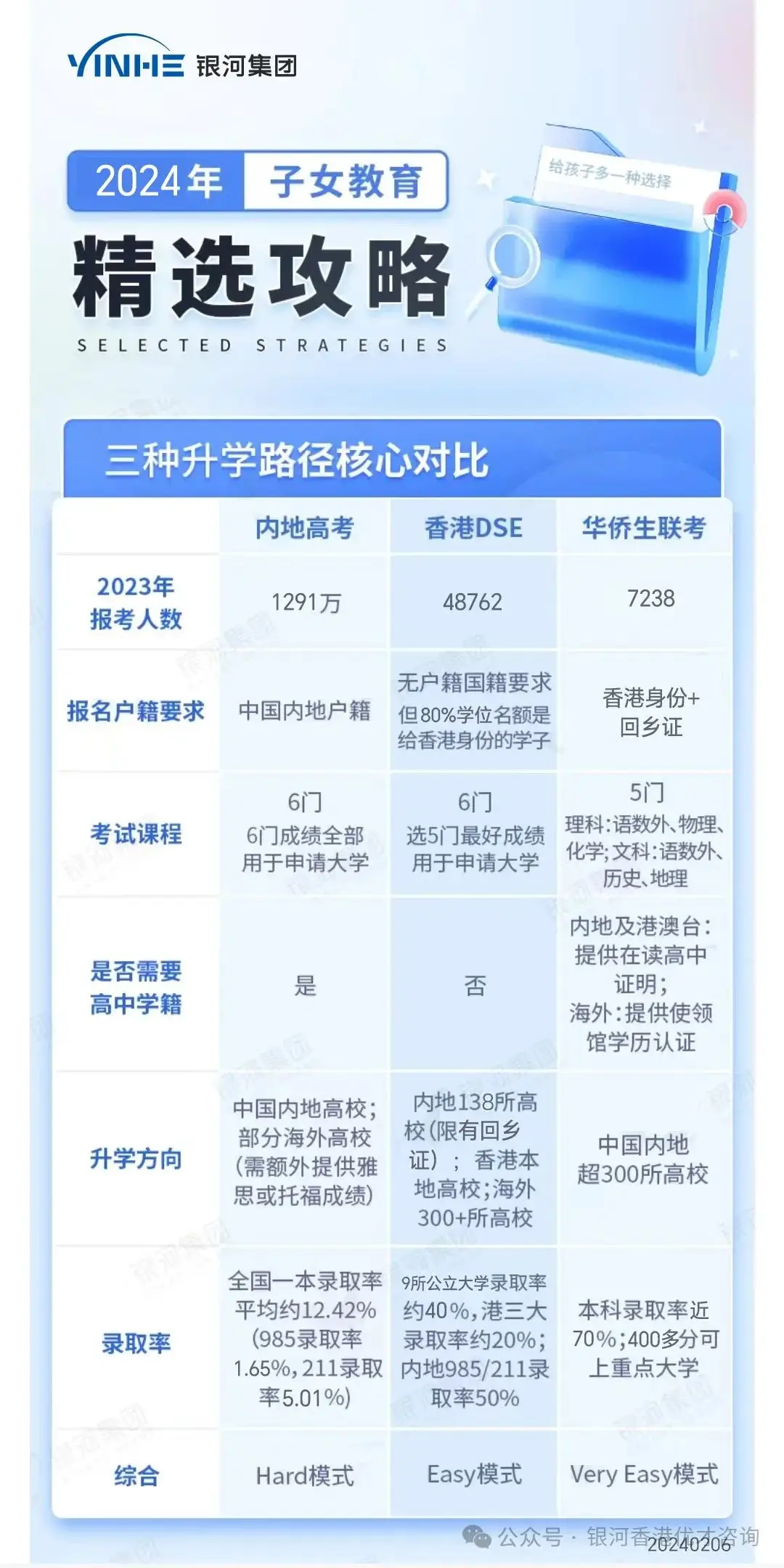 又有一种情形是,孩子办理了回乡证,这表明其内地户口已被注销,此时孩子便无法再参与内地普通高考了,然而却能够换一种途径,凭借港籍生的身份去参加专门为他们所设计的“港澳台华侨生联考”,而这条路径的录取分数要低很多。