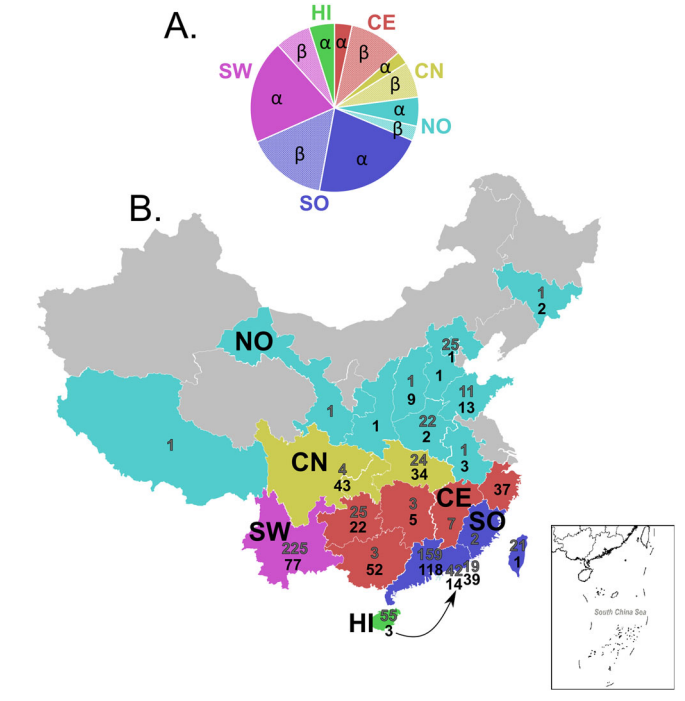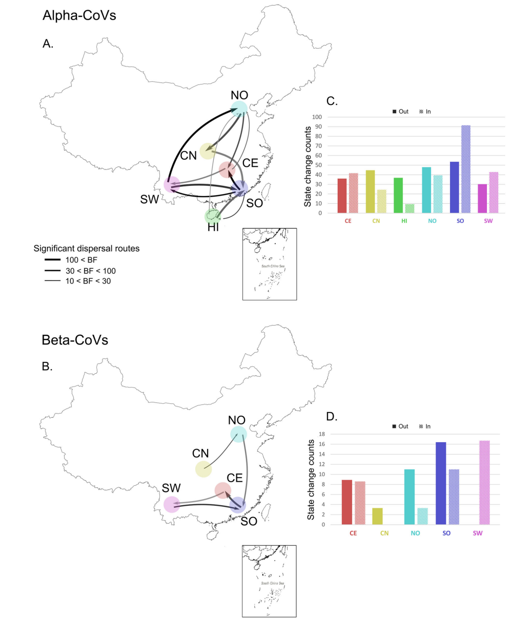 研究小组绘制出了冠状病毒于中国的传播地图,发觉西南地区乃是冠状病毒进化的热点地带,云南、广西等地的蝙蝠种类繁多,病毒多样性亦是最高的,此处复杂的地形以及气候为蝙蝠供给了多样化的栖息场所。