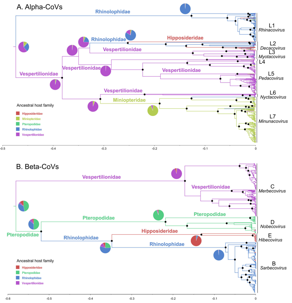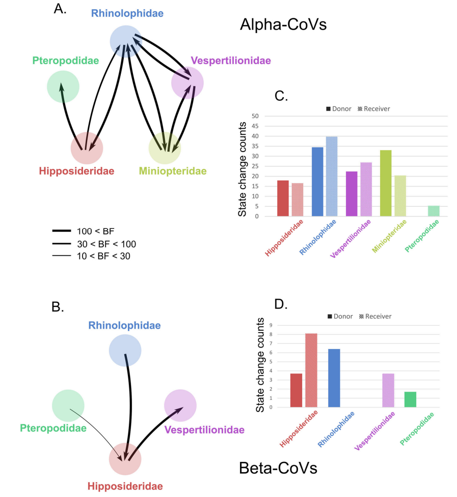 相对“保守”的是β型冠状病毒,它们将宿主交换主要限定于亲缘关系比较相近的蝙蝠种类的范围之内,属于这一类的是SARS相关的病毒,其主要在像马蹄蝠等特定的蝙蝠群体里面开展传播,正是这种传播特性使得它们的扩散路径更易于被追踪。