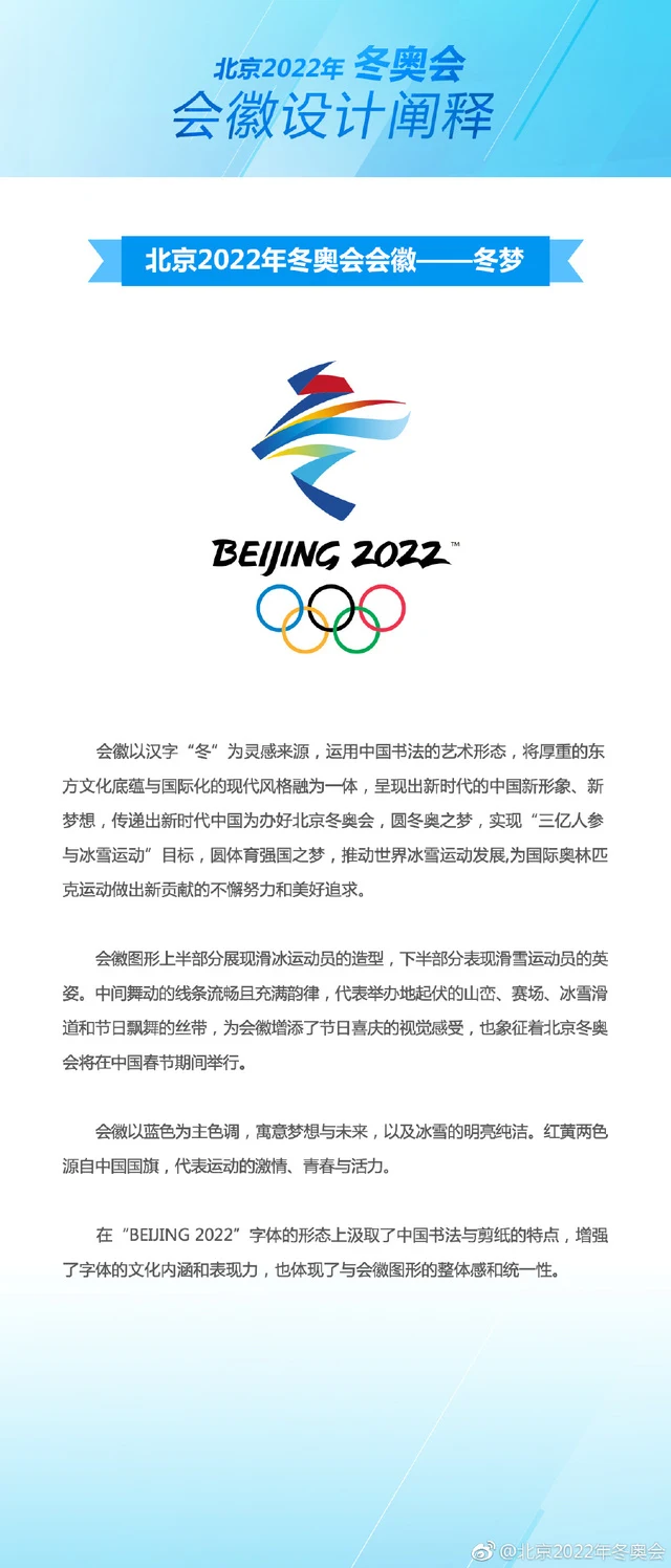 “冬梦”并非仅仅是一个体育方面的标志,它借助汉字的形态,将冰雪运动所具有的动感同中国书法所蕴含的韵味相互结合在一起,会徽之中呈现飘舞状态的丝带元素,恰巧呼应了北京冬奥会将会在2022年中国春节期间举行的这一事实,凭借这个视觉符号,中国朝着世界传递出了冬奥理念,并且展示了中华文化针对“冬”这个字的独特理解。
