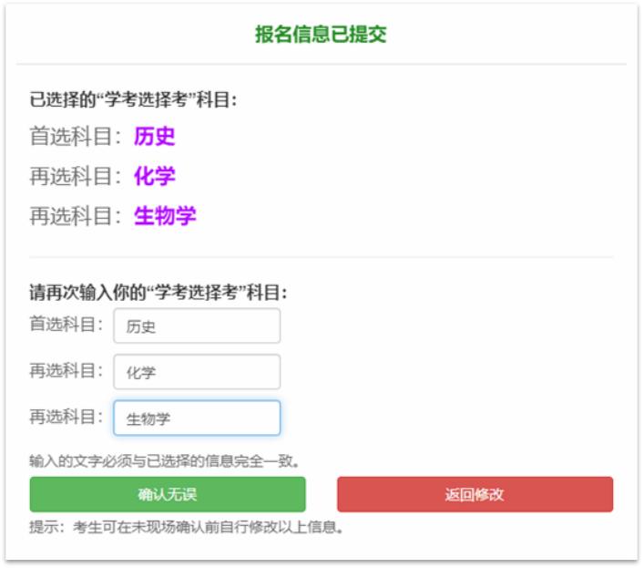 当基本信息被填写完毕之后,点击那个被称作“提交报名”的按钮,此时系统就会弹出一个提示框,要求考生再次以手动的方式去输入首选科目,与此同时还要输入再选科目。所输入的文字必须要和系统所显示的内容一模一样,并且顺序也要完全相同,不能有一个字的差别,不然的话就没办法提交。这样的设计是为了避免防止考生选错科目,因为每年都会有考生由于手误而在这个地方被卡住。
