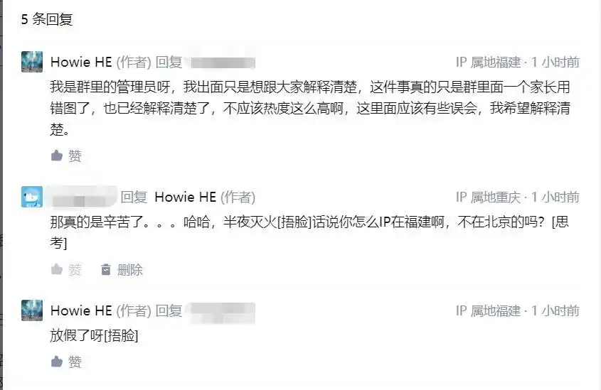 在一番解释当中,名为“ Howie HE”的这人透露出来一项关键细节:发错图片的那个人实际上是群里身为家长的一员,并且这位身为家长的人还是管理人员。他做出解释称,为了能够及时去清理群里存在的垃圾信息,他们特地将一些相对比较热情的家长设置成为了管理员,以此帮忙维护群聊的秩序。未曾想到好心却办成了坏事,家长错误地发送图片从而引发了这一场风波。