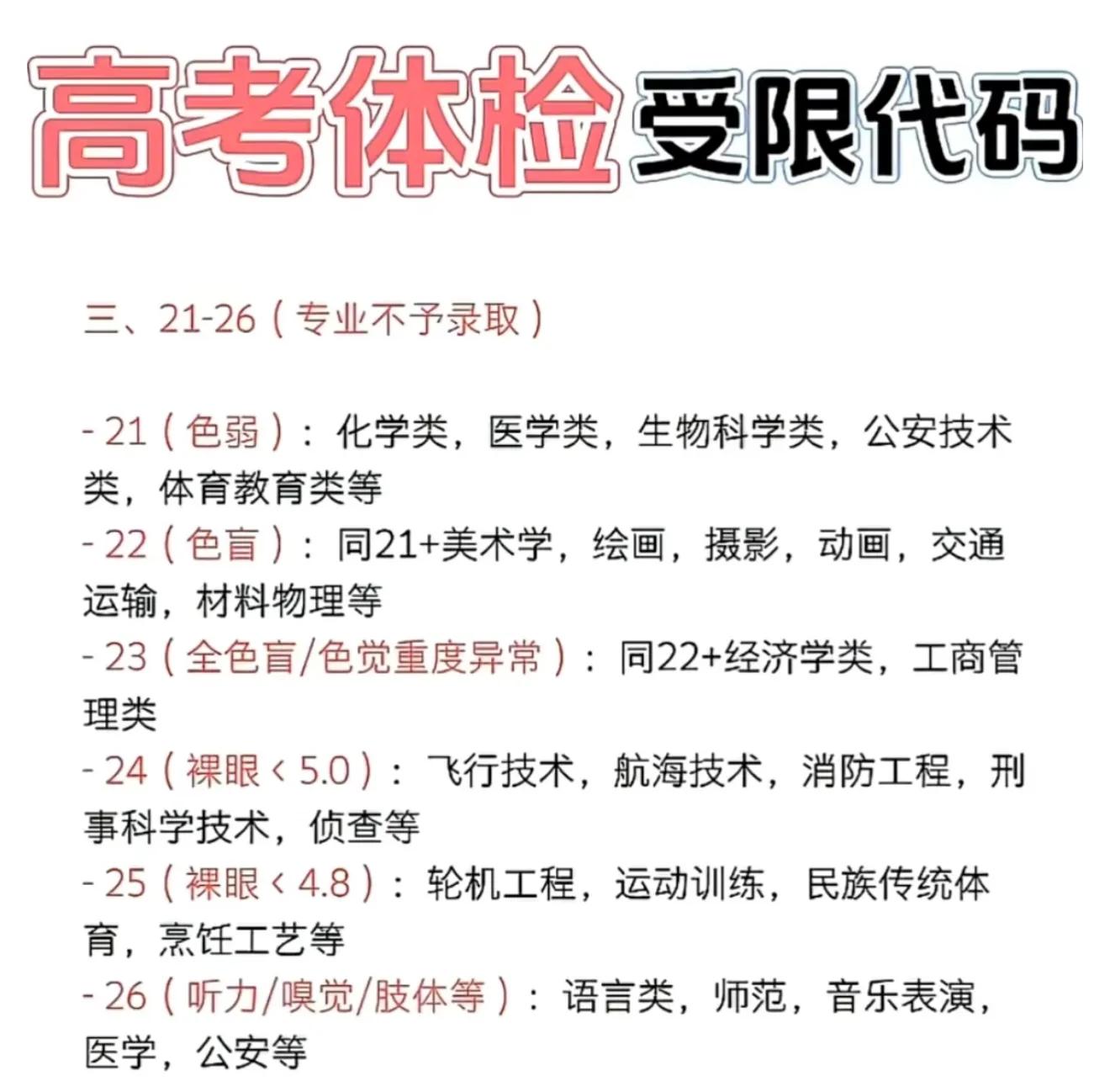这类代码高校不会直接拒绝予以录取,然而在专业选择方面得格外慎重小心。比如说有做过重大手术的孩子,像地质、土木、公安类这类 require 高体能消耗的专业就并不适宜。要是高度近视超过 800 度的,测绘、航海、野外作业类专业最好尽量避开。