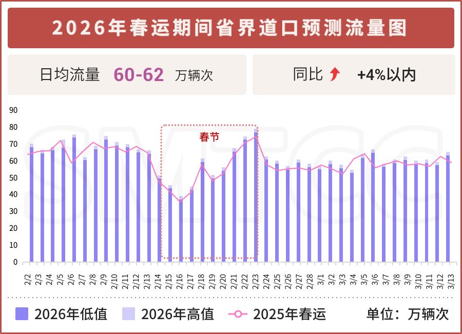 车主里边那些需要进行跨省出行的,省界道口的通行状况对他们而言相当关键。预计在整个春运一直持续期间,省界道口日均流量乃是处于60万直到62万辆次这个范围之内,跟同比相比增长情形大概是4%。当中,高速公路担负起了省界道口大约74%的流量职责,它属于跨省出行的主要通道。