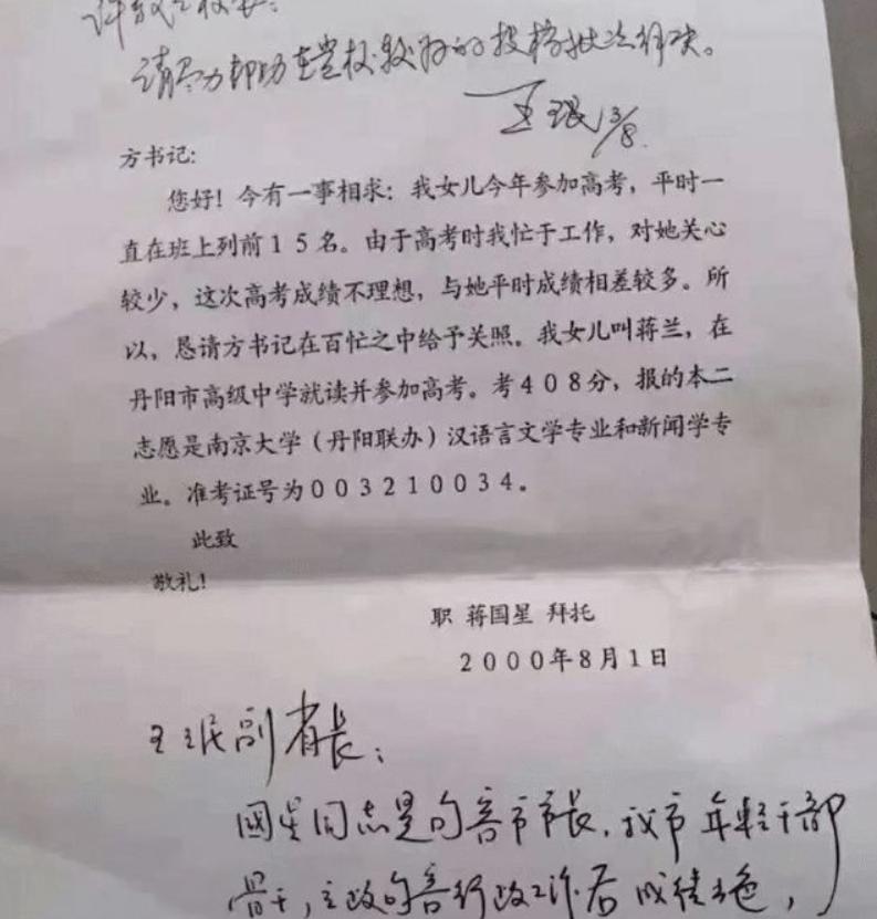 网上有一封亲笔信流传着,这信是原江苏句容市市长蒋国星写给南京大学校长的。在该信当中,蒋国星讲自己女儿蒋兰平常成绩挺好,常常处于班级前十五名,然而由于自己工作过于忙碌从而疏于照料,致使女儿高考失利,只考了408分。他期盼校方能够破格录取女儿到某专业去读书。