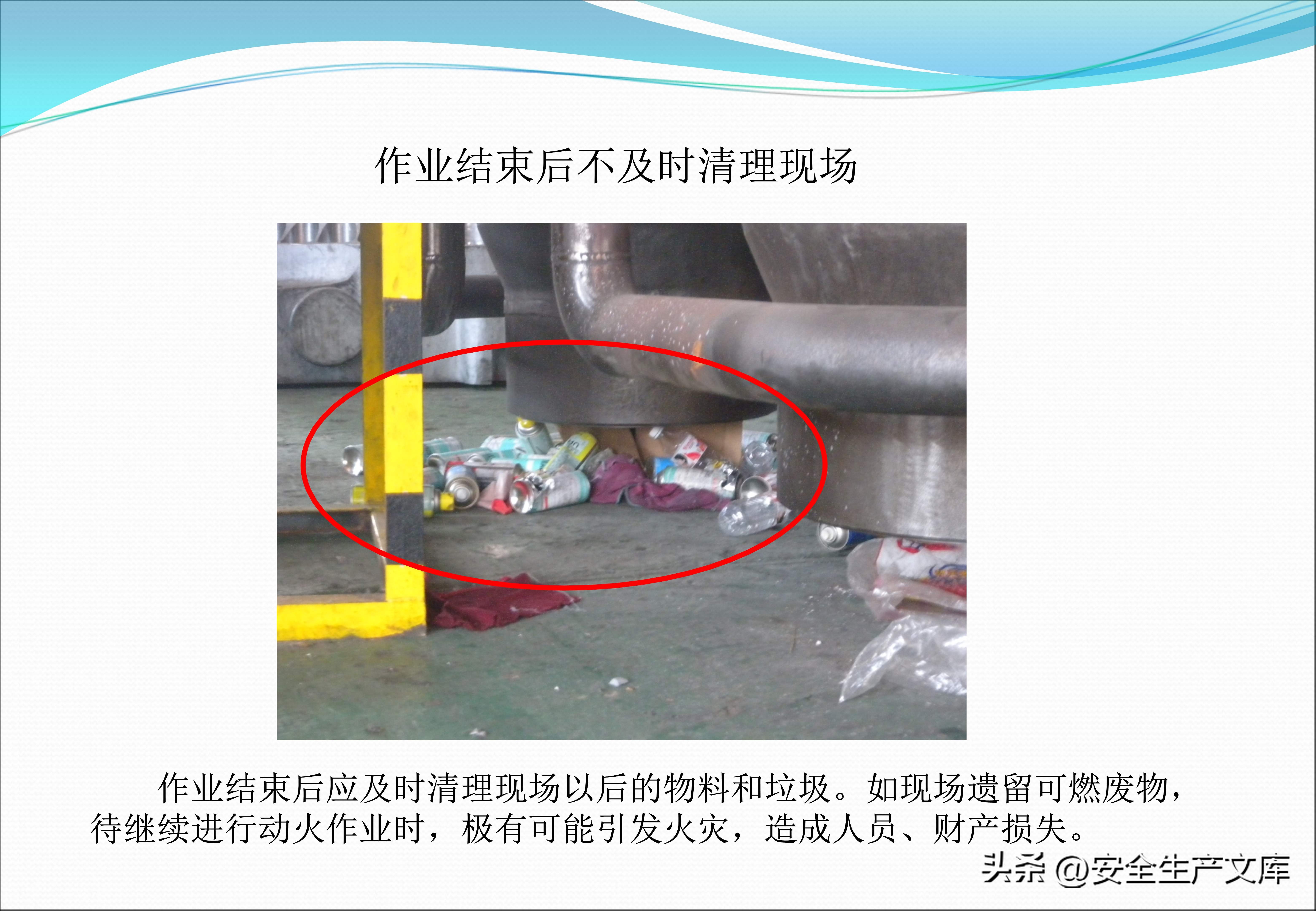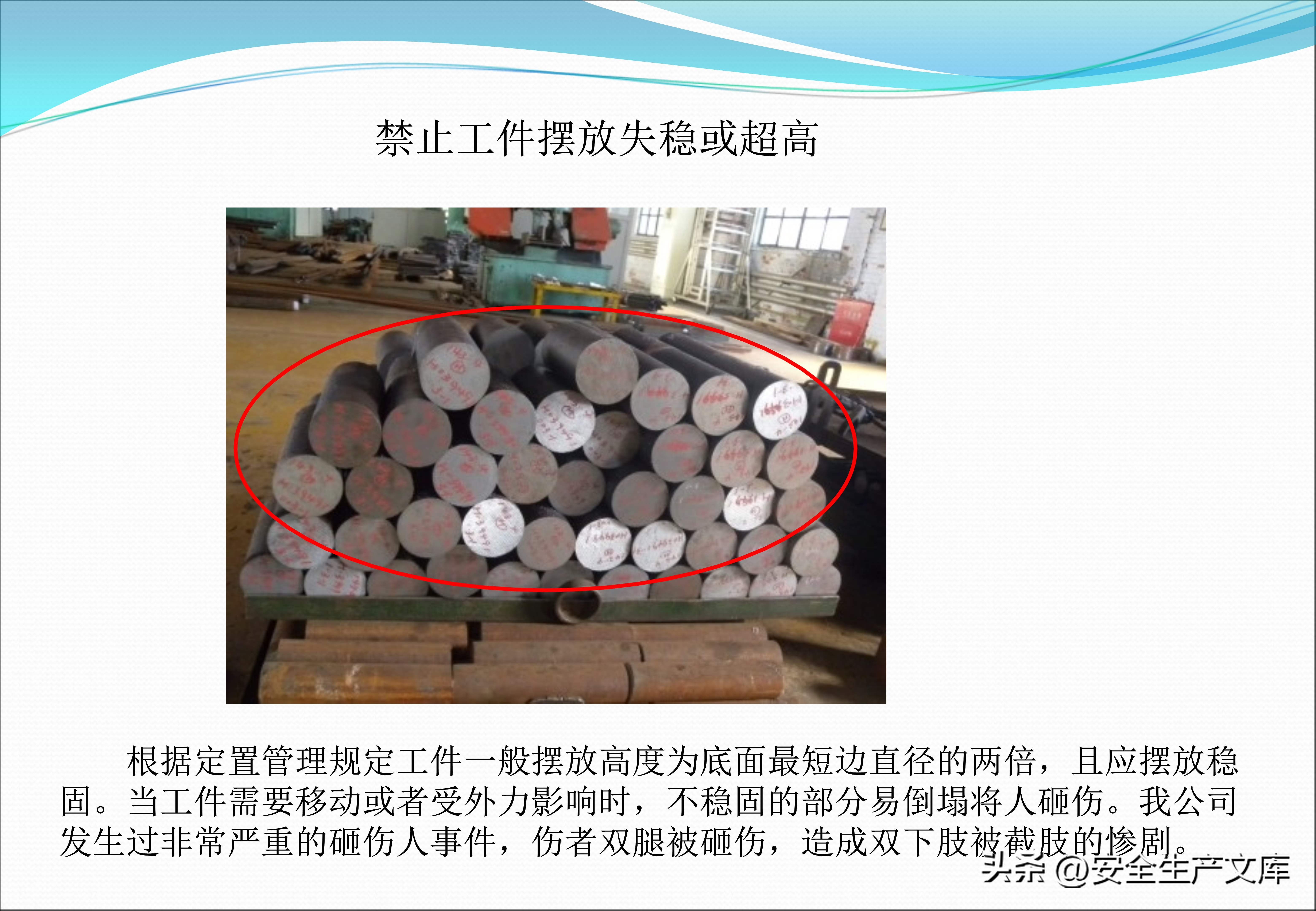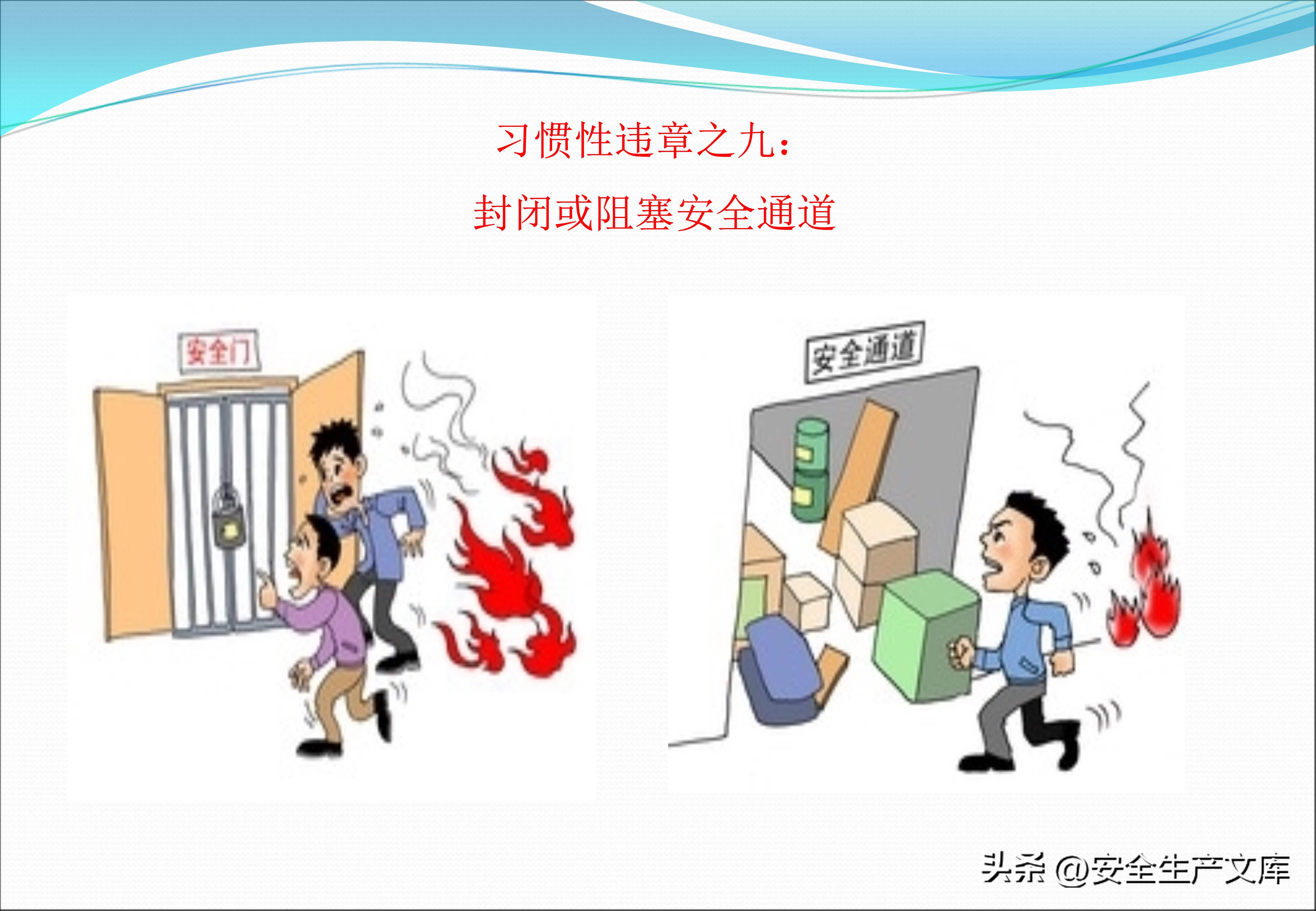 同样不能忽视现场定置管理,在工件摆放超高、失稳的图例里,堆叠的钢板忽然倒塌,将旁边的工人压住了,气瓶没有防倾倒措施,随意靠在墙边,一旦倒下,就会撞断阀门,安全通道被货物堵塞,在图例中发生火灾时工人没法逃生,这些画面都在提示,现场混乱乃是事故的温床,唯有规范管理才可杜绝隐患。