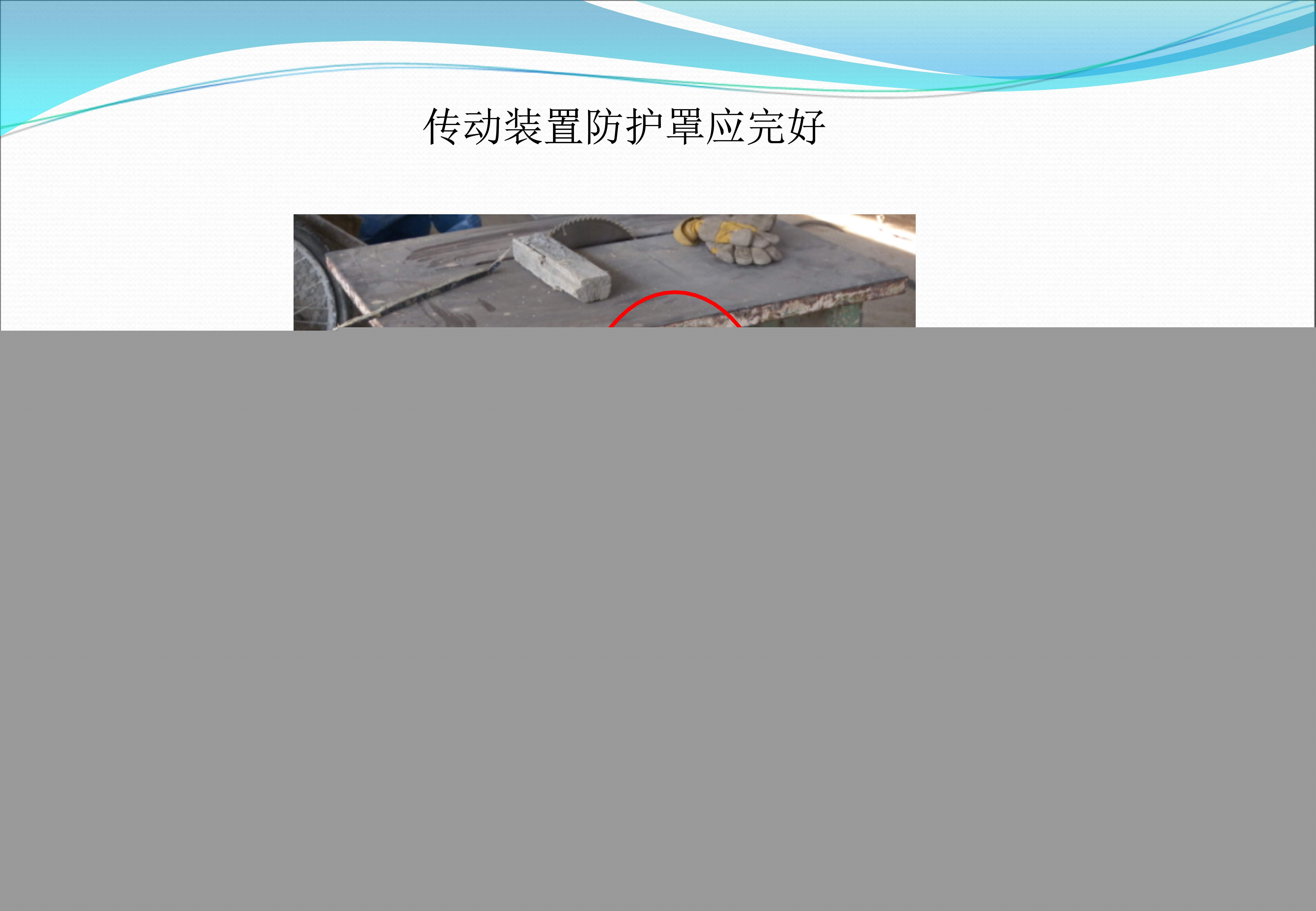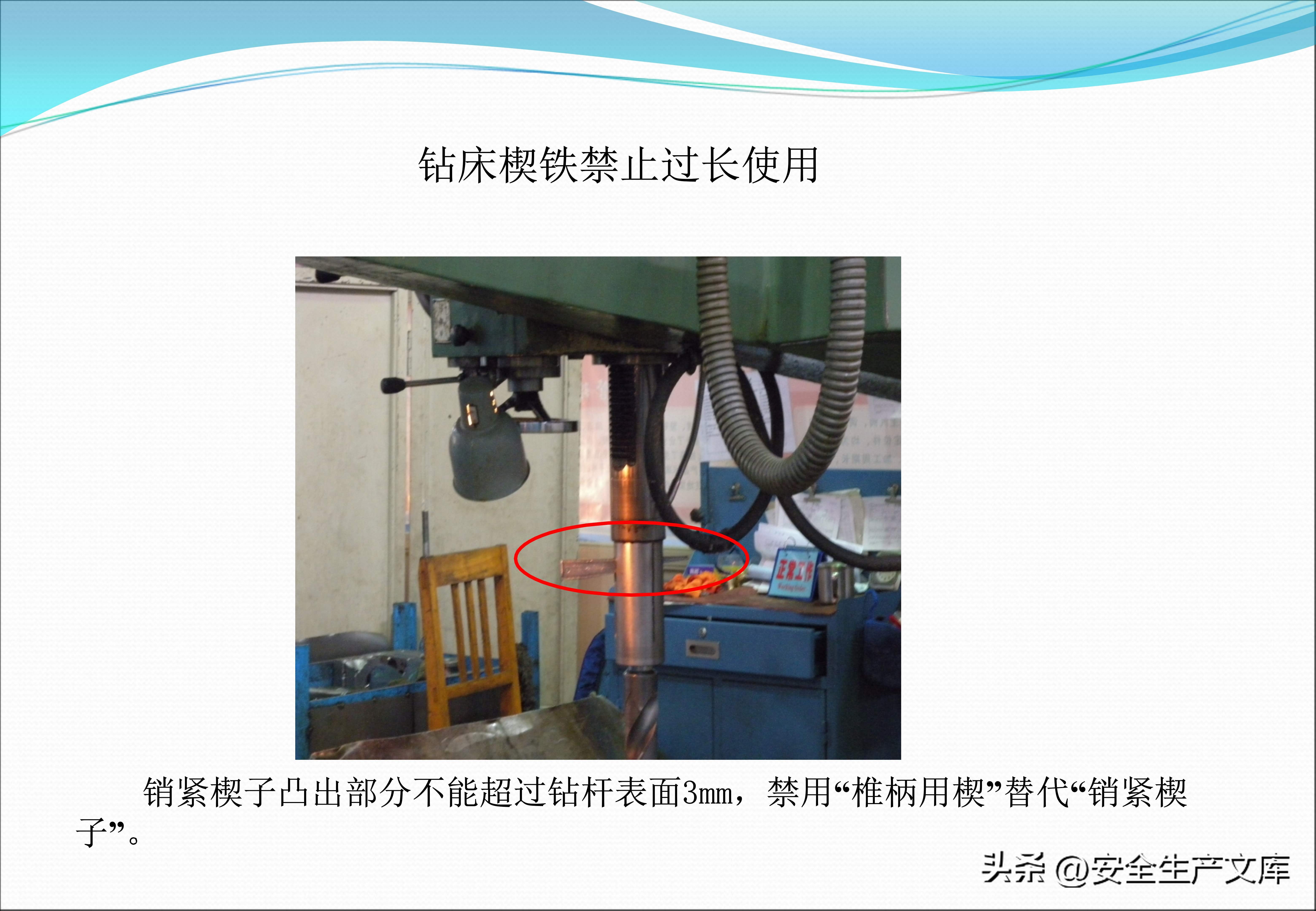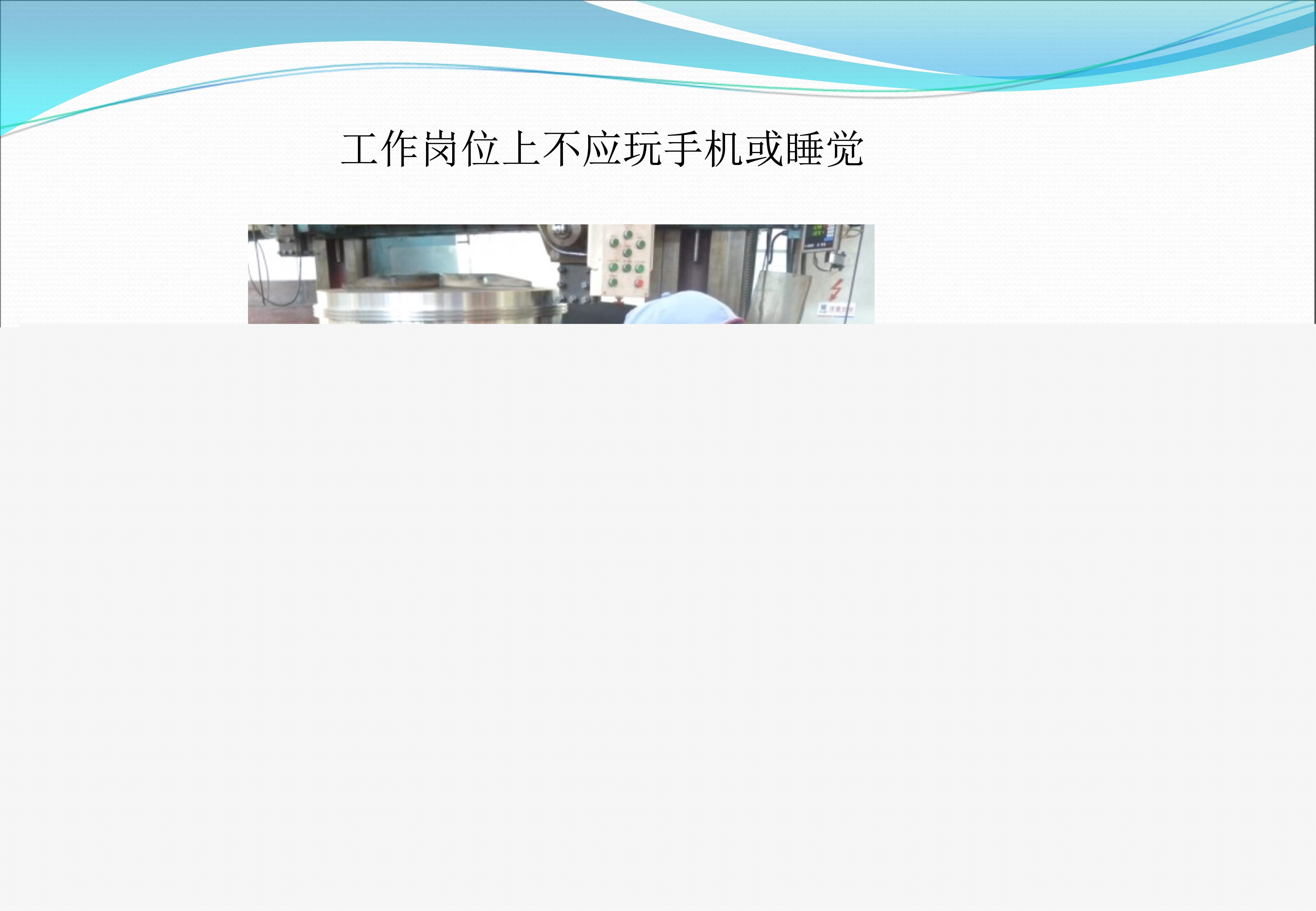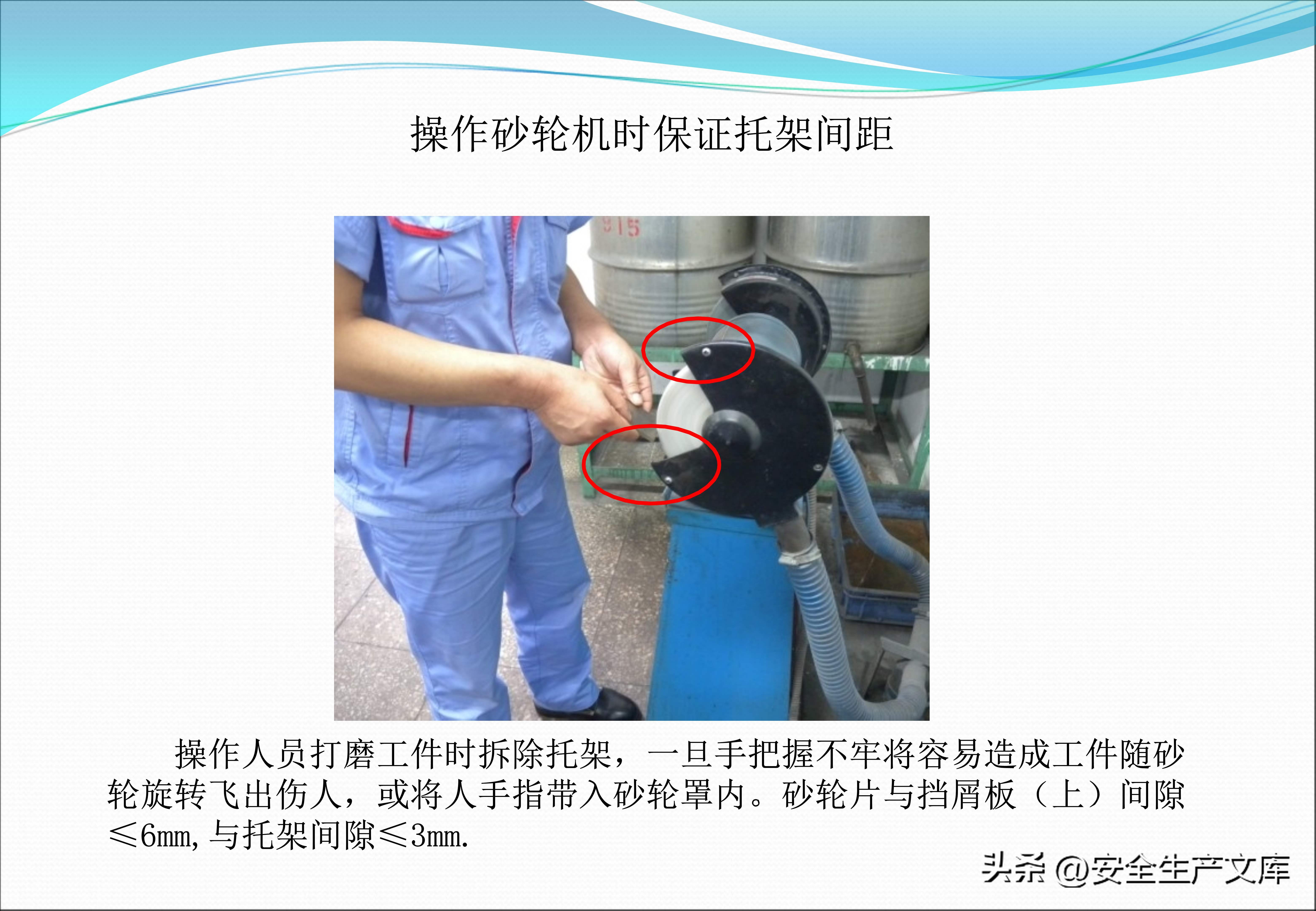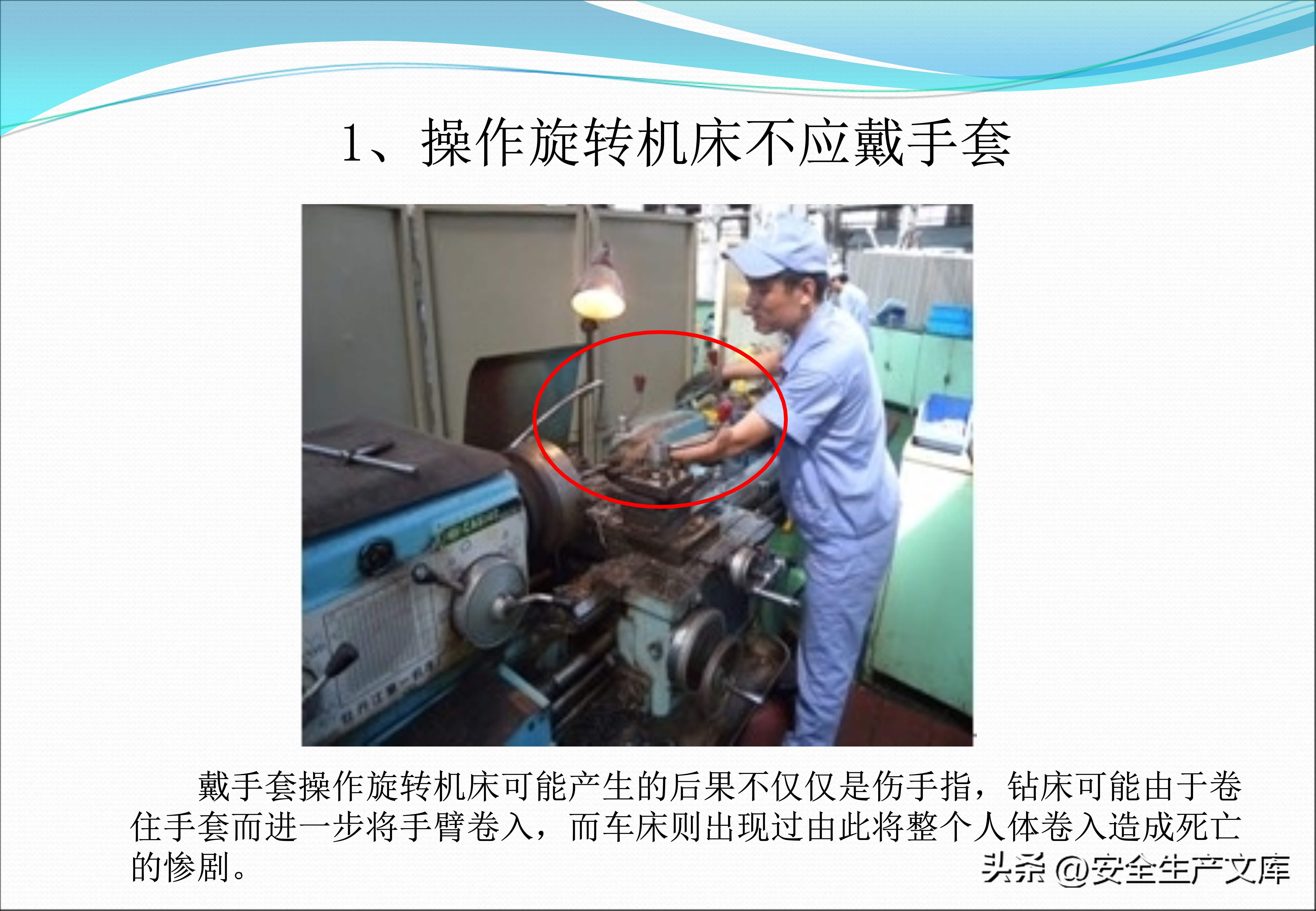 旋转机床的操控安全存在着严格的规定,课件借助对比图呈现出正确与错误的做法。在错误的示范当中,工人操作车床时戴着手套,手套的边缘已然被切屑缠绕;而正确的示范表明操作者双手是干净的,袖口扎得很紧,与旋转的部位维持着安全的距离。砂轮作业必须要同时佩戴护目镜、耳塞以及防尘口罩,图例里展现出飞溅的火花和粉尘对眼睛、耳朵、肺部造成的三重伤害。